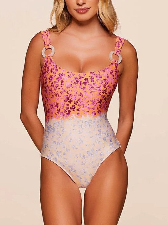 Fato de banho tipo regata com alças largas sem regulagem, detalhe de argolas de madrepérola e decote profundo nas costas.