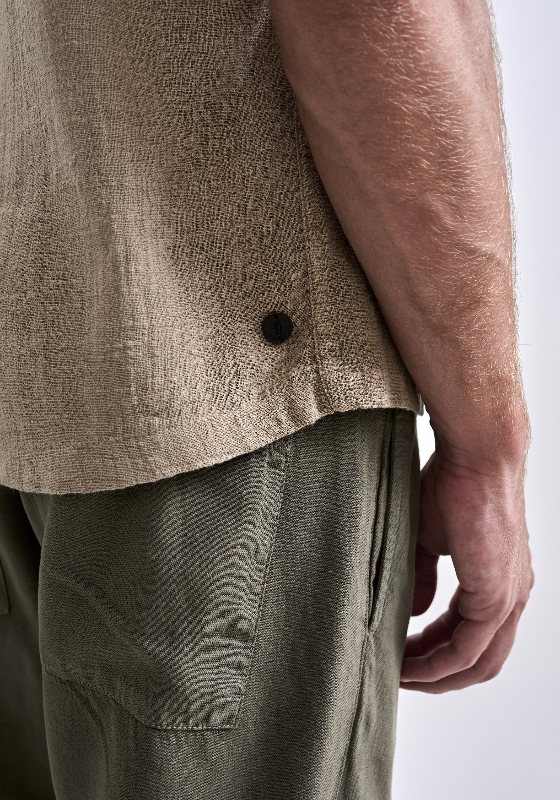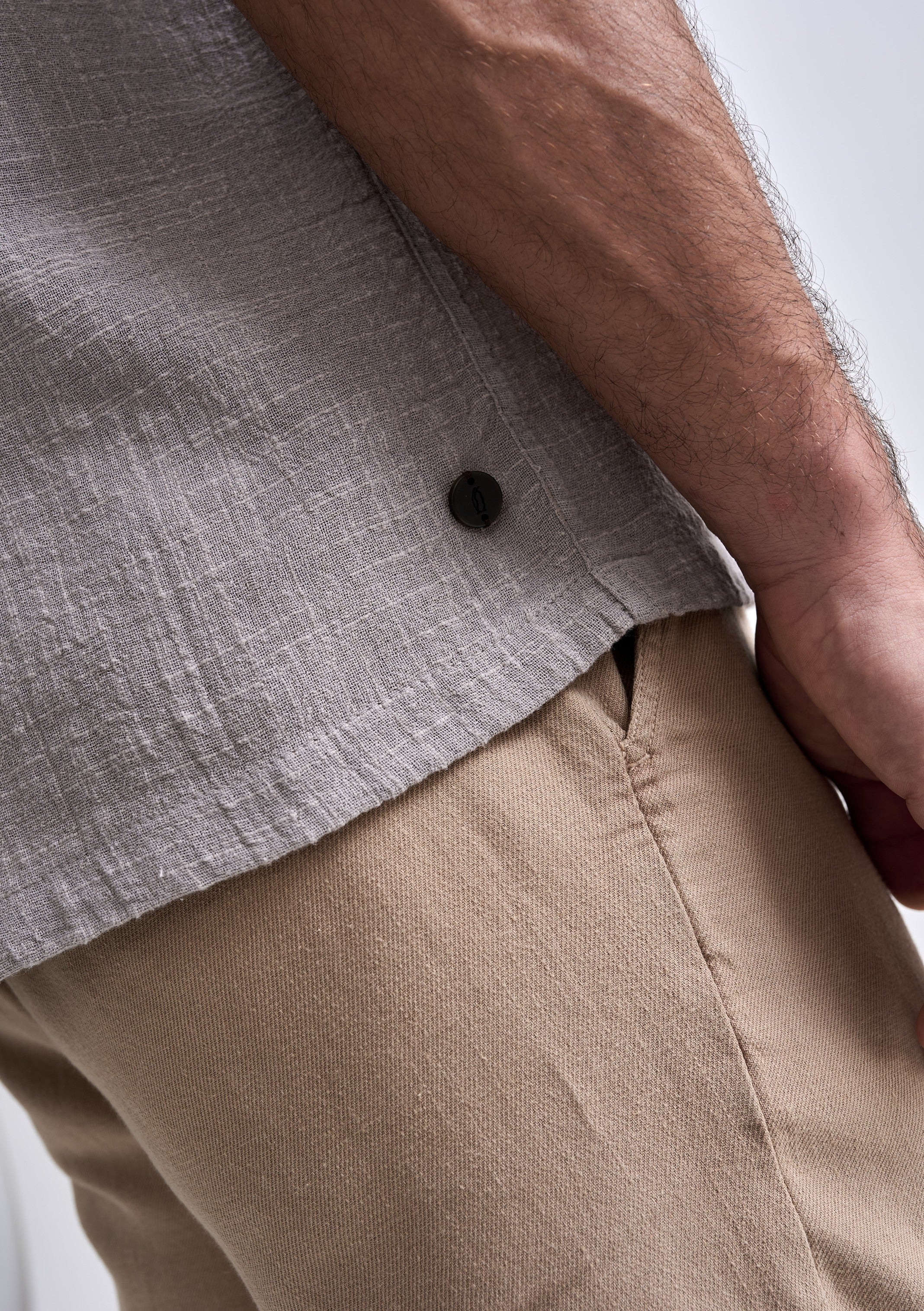 A Camisa Carmel Manga Curta é confeccionada em um tecido plano que combina algodão e viscose, proporcionando respirabilidade, leveza e um toque macio. Essa composição garante conforto para o uso diário, com um caimento natural e agradável ao corpo.