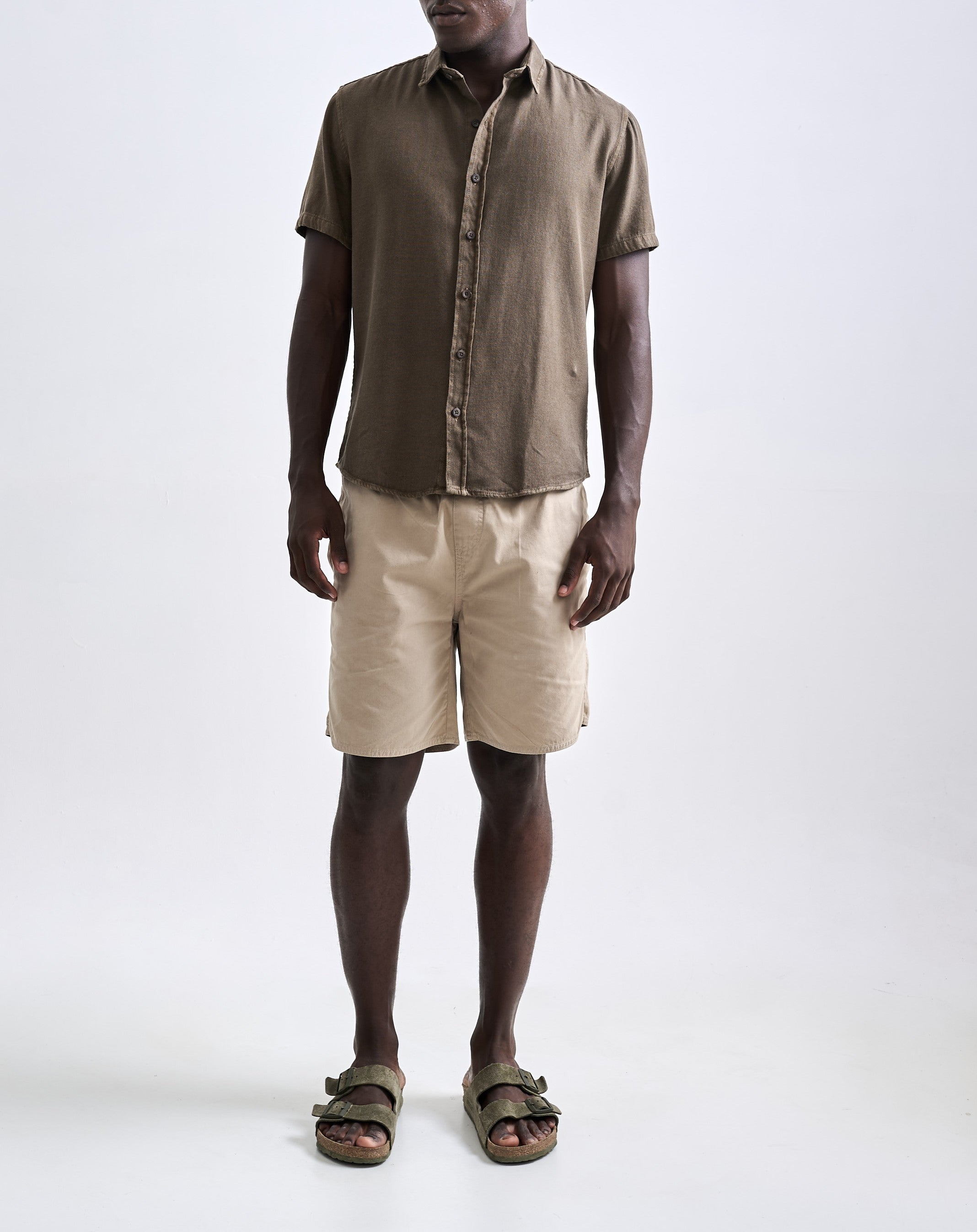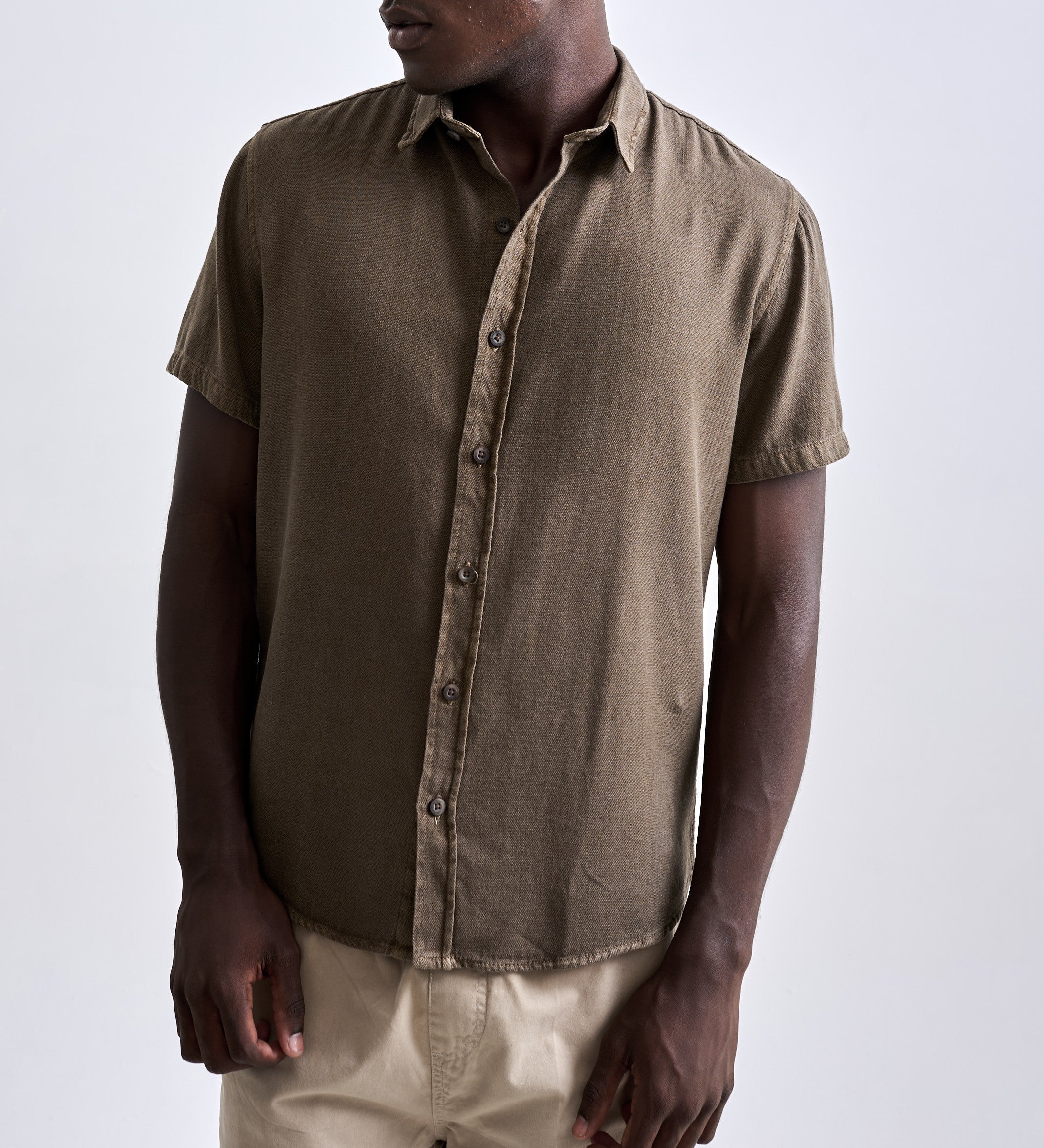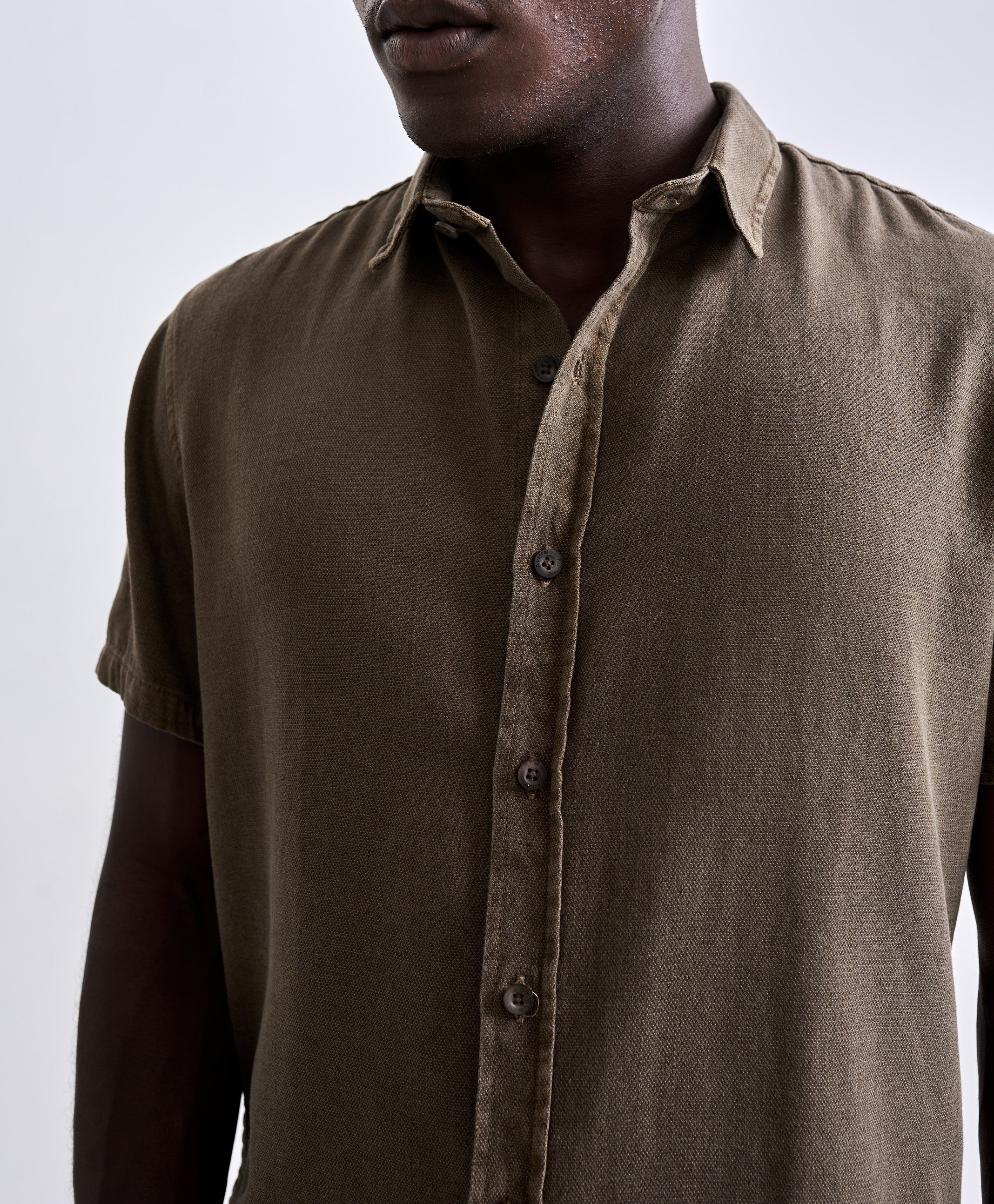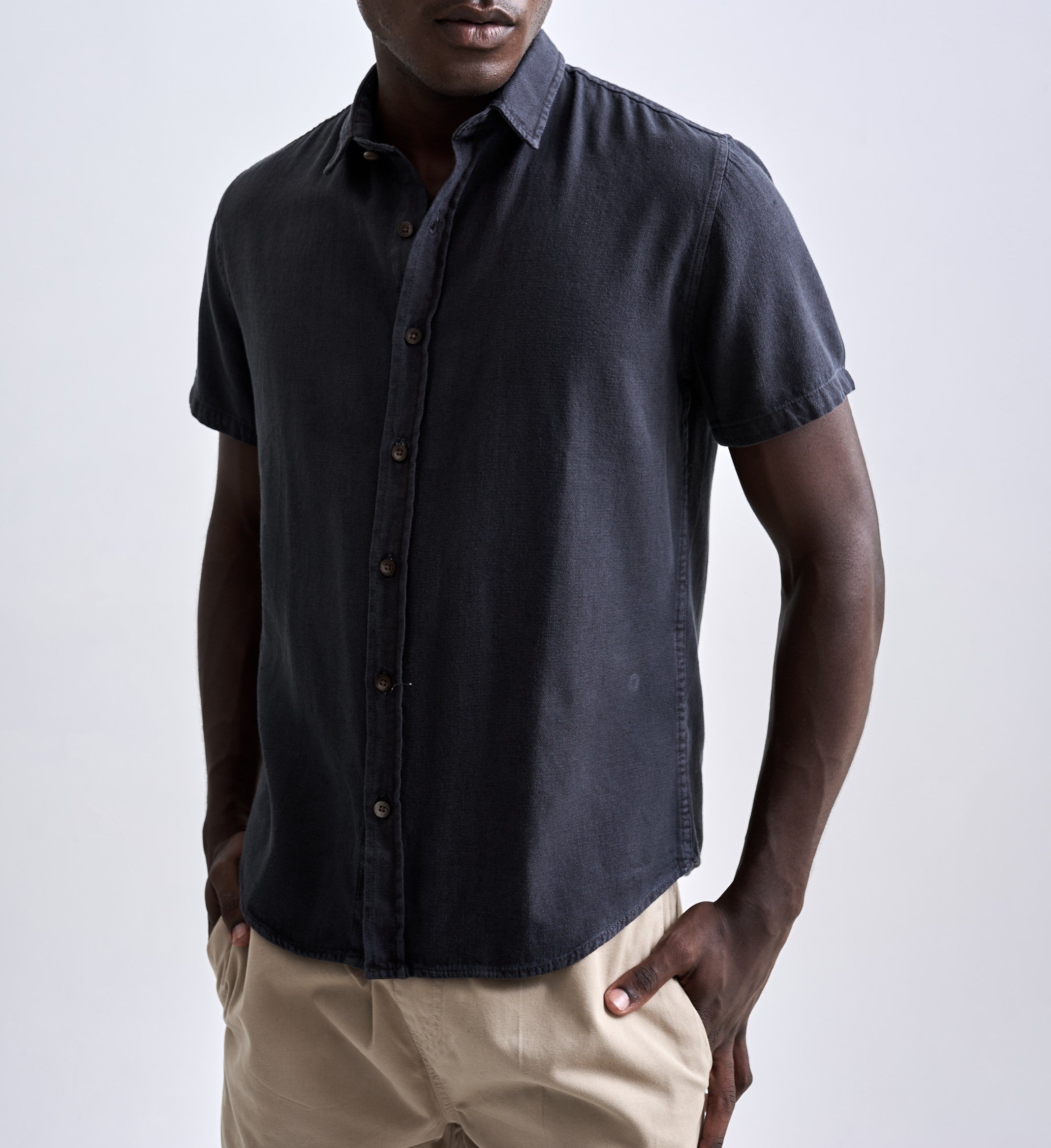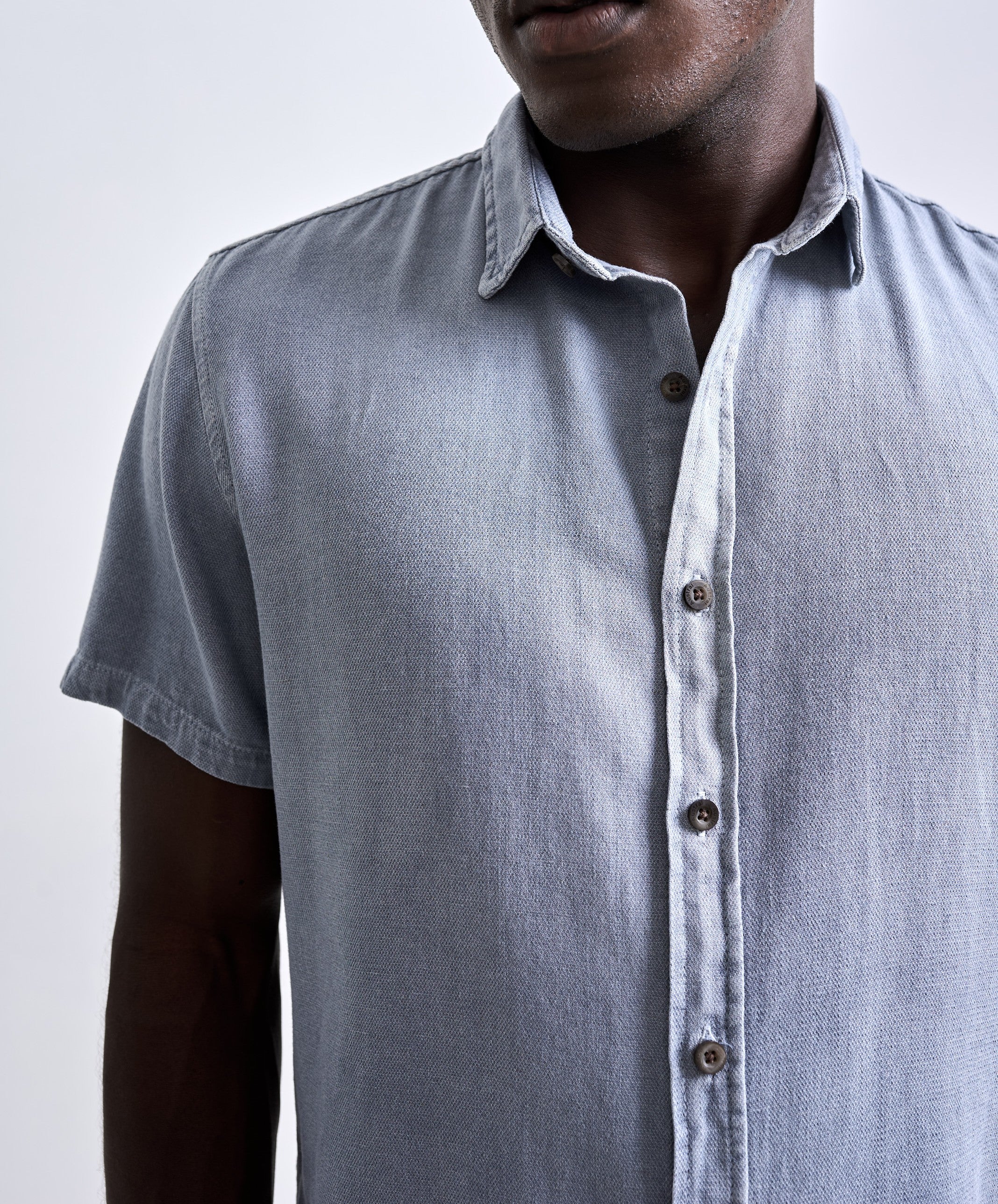 A Camisa Monterey Manga Curta é confeccionada em um tecido plano com estrutura twill, composto por um blend de algodão, viscose e linho. Essa combinação garante um toque suave, alta respirabilidade e um caimento natural, proporcionando conforto durante o
