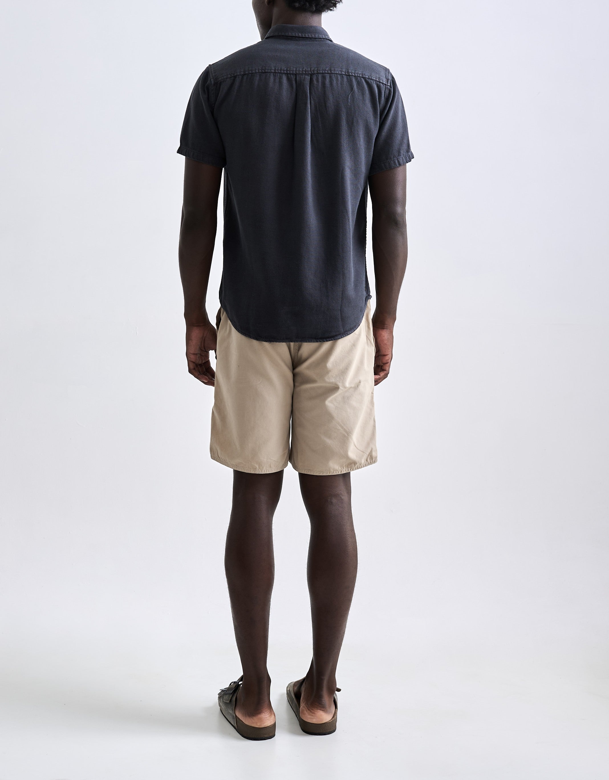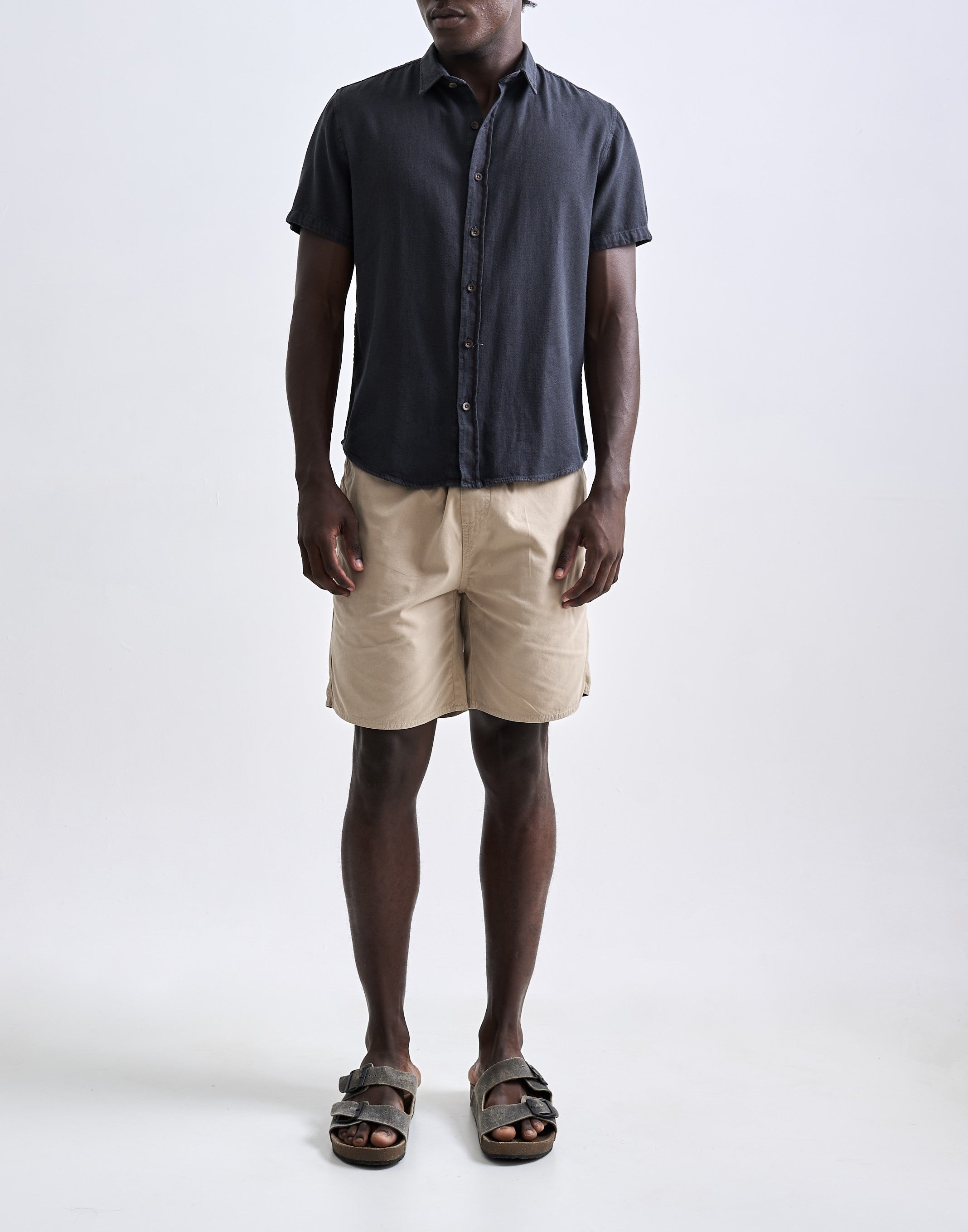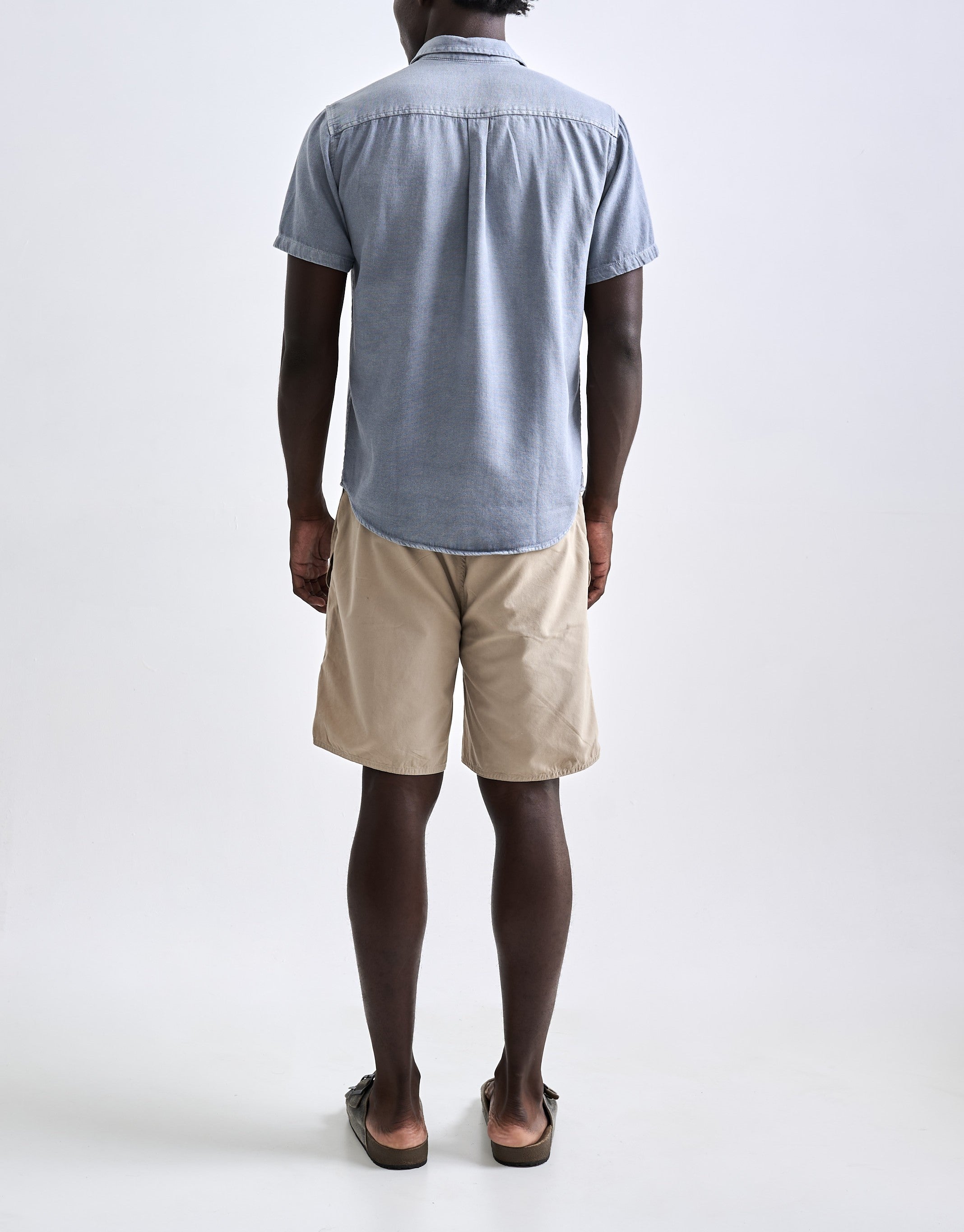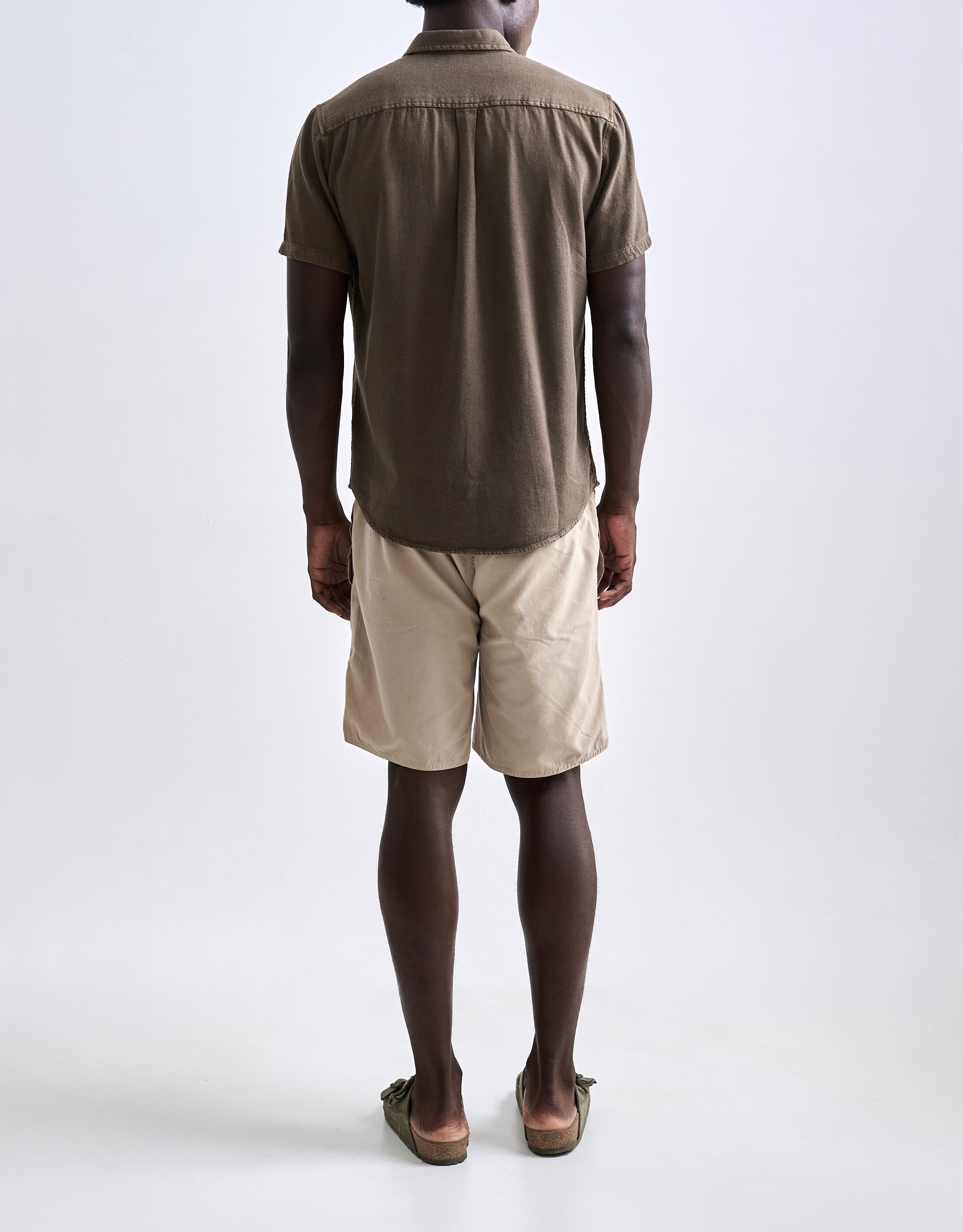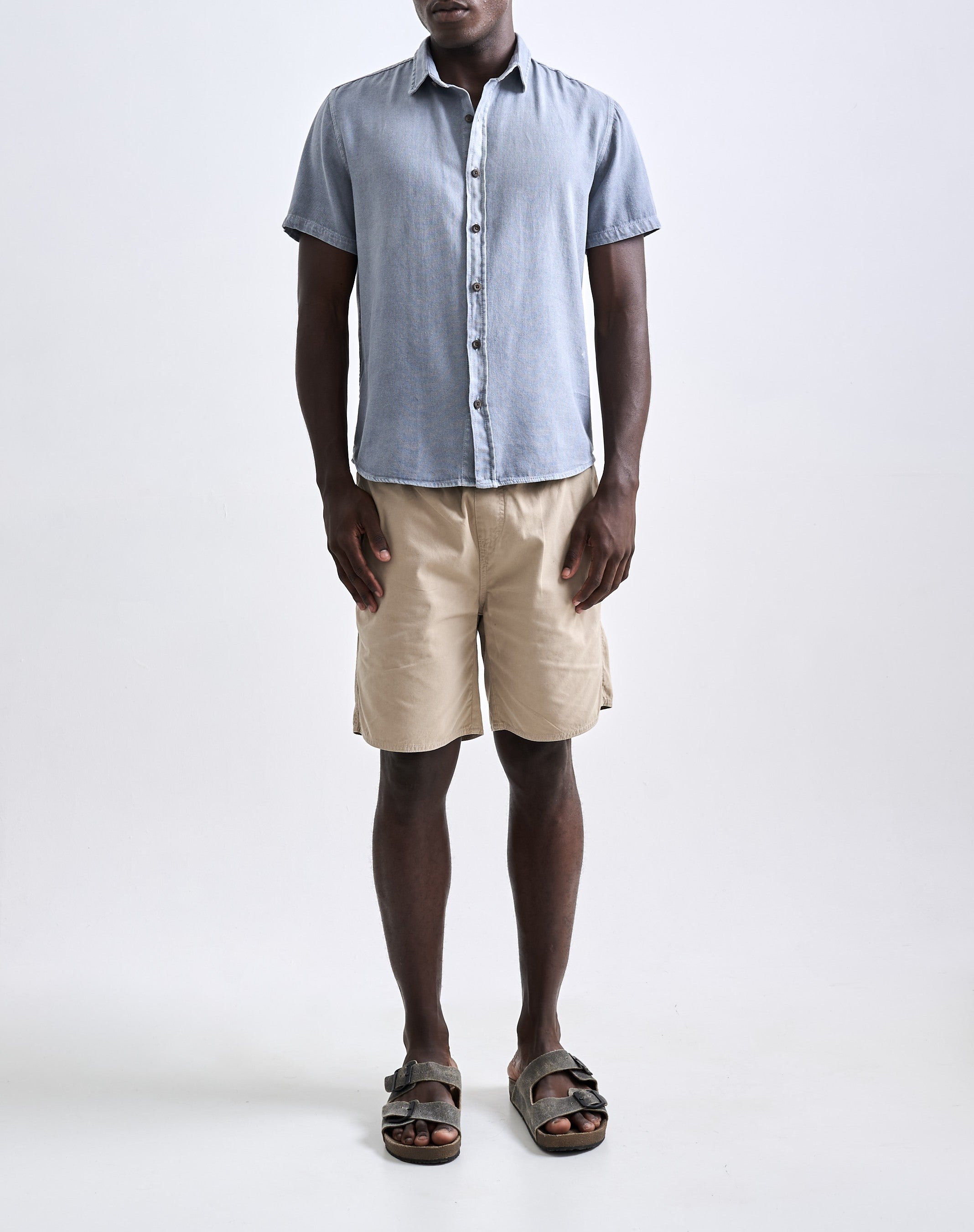 A Camisa Monterey Manga Curta é confeccionada em um tecido plano com estrutura twill, composto por um blend de algodão, viscose e linho. Essa combinação garante um toque suave, alta respirabilidade e um caimento natural, proporcionando conforto durante o