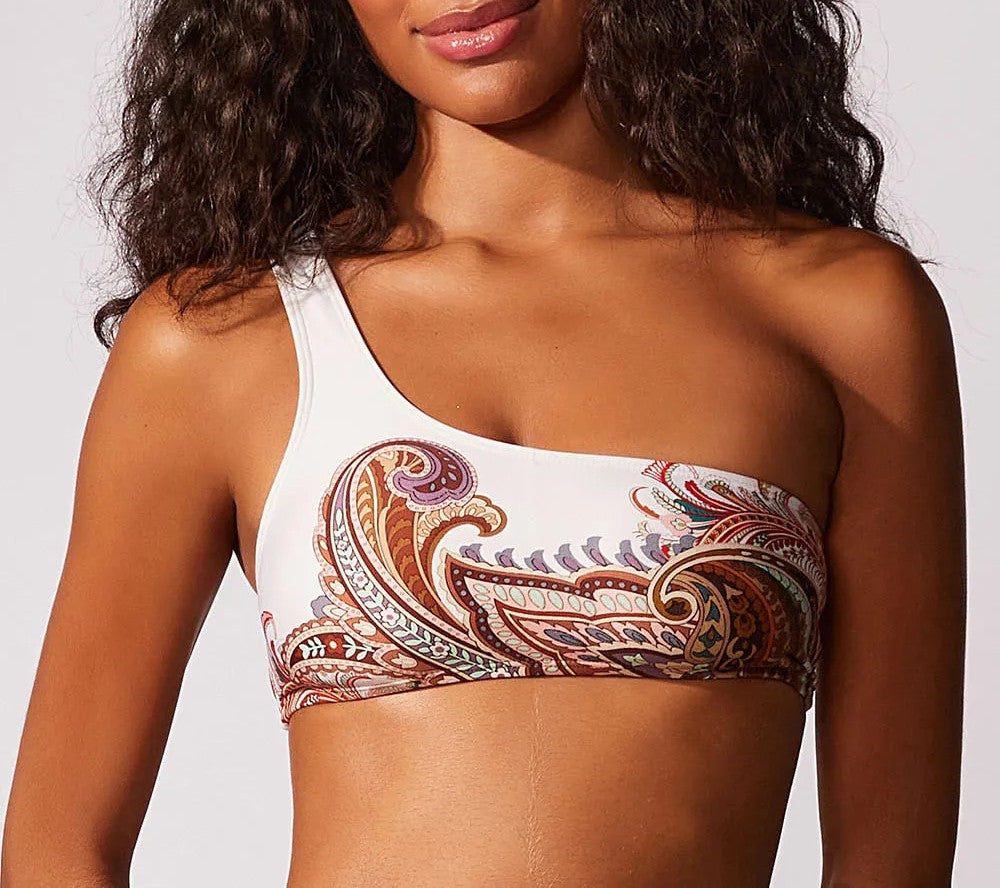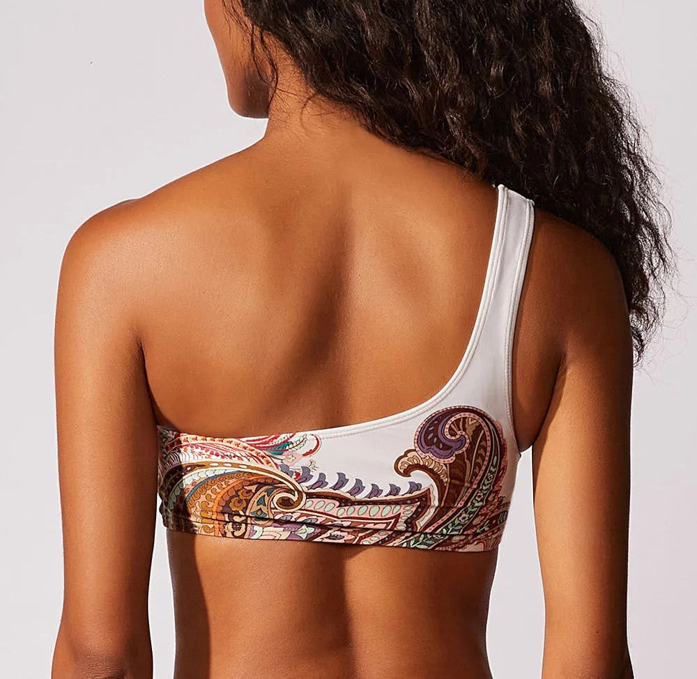Top ombro único estampado. Modelo possui bojo removível e estampa localizada