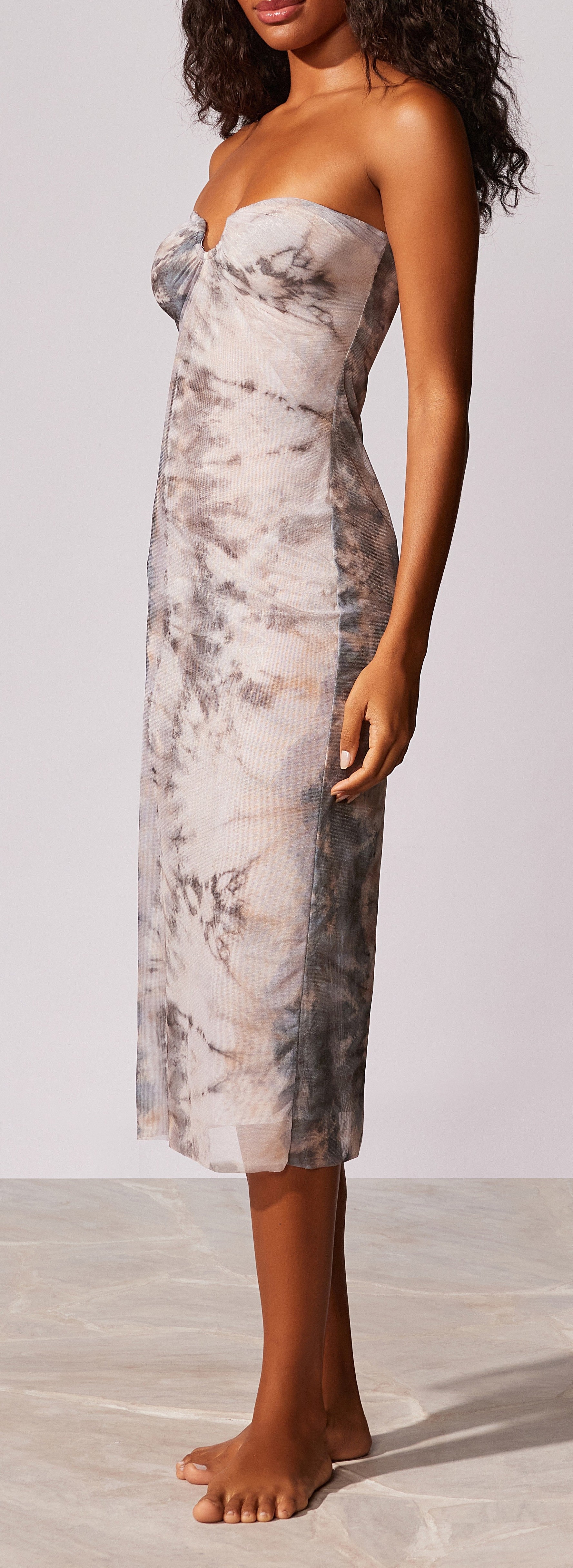 Vestido midi estampado tomara que caia com aro no busto, silicone no decote e bojo removível