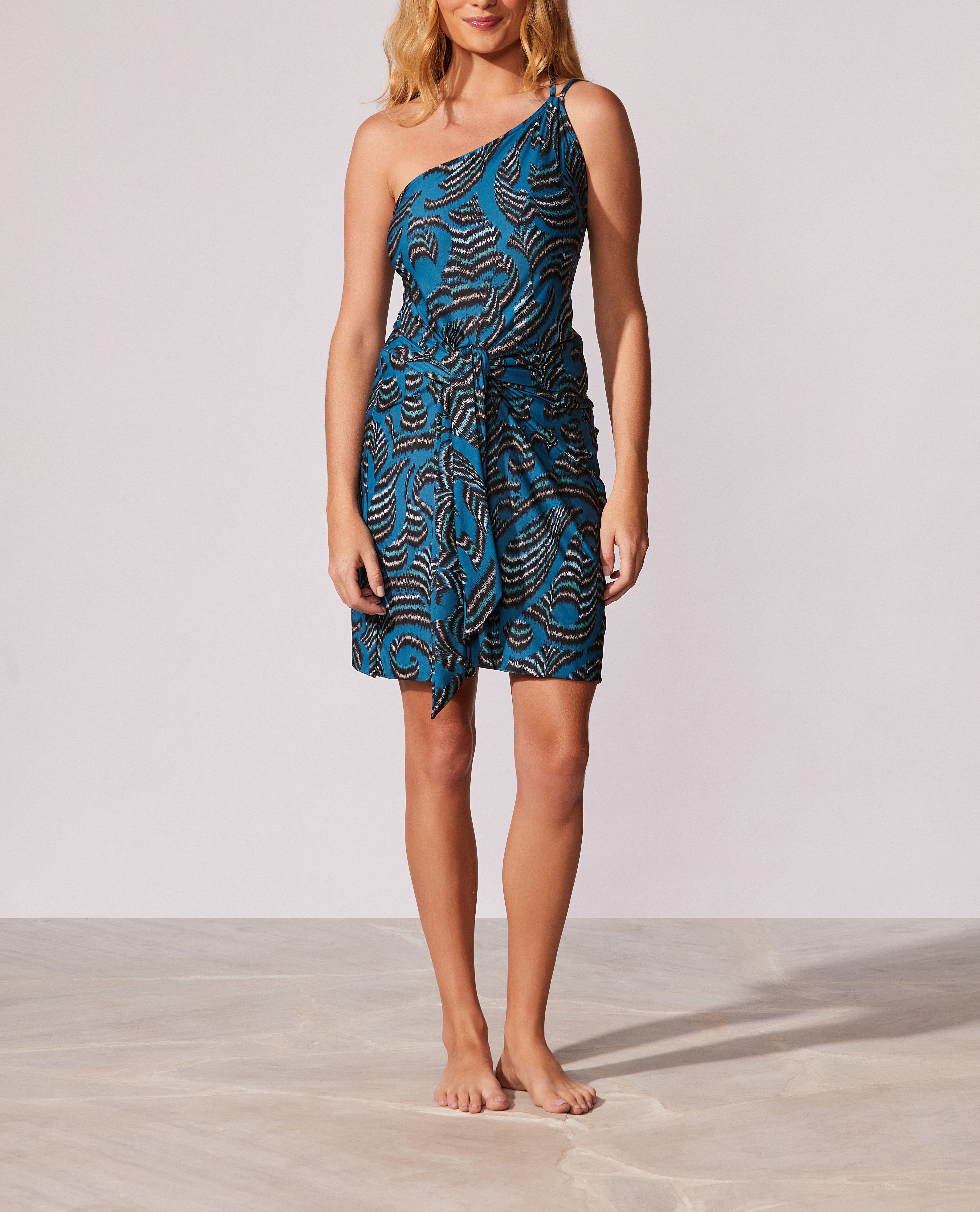 Vestido curto estampado de um ombro só com detalhe de nó na lateral.