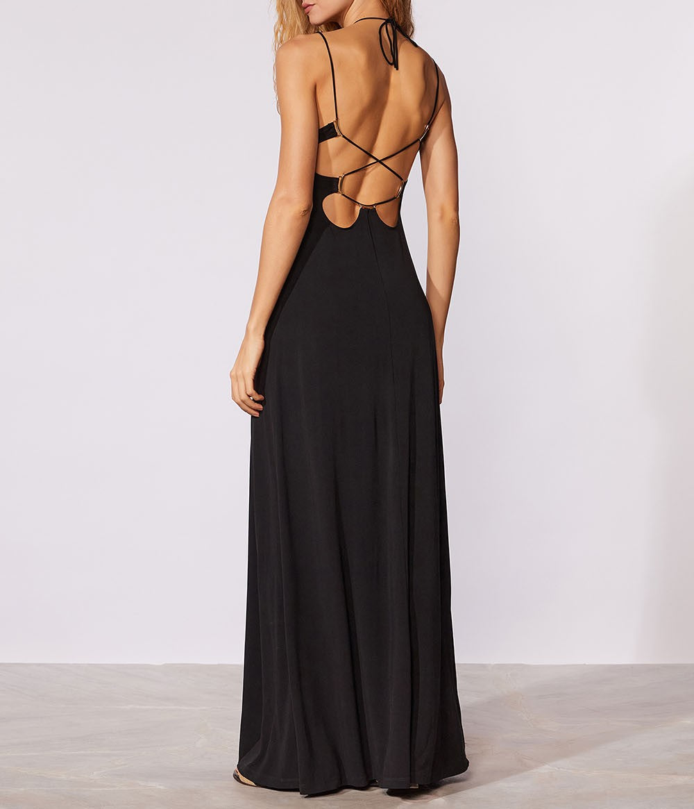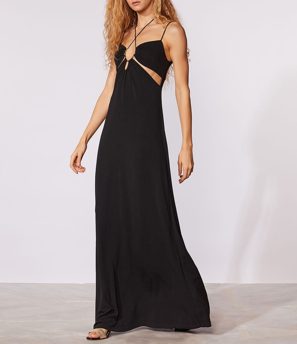 Vestido longo liso com detalhe de aviamentos, recortes e alças finas transpassadas
