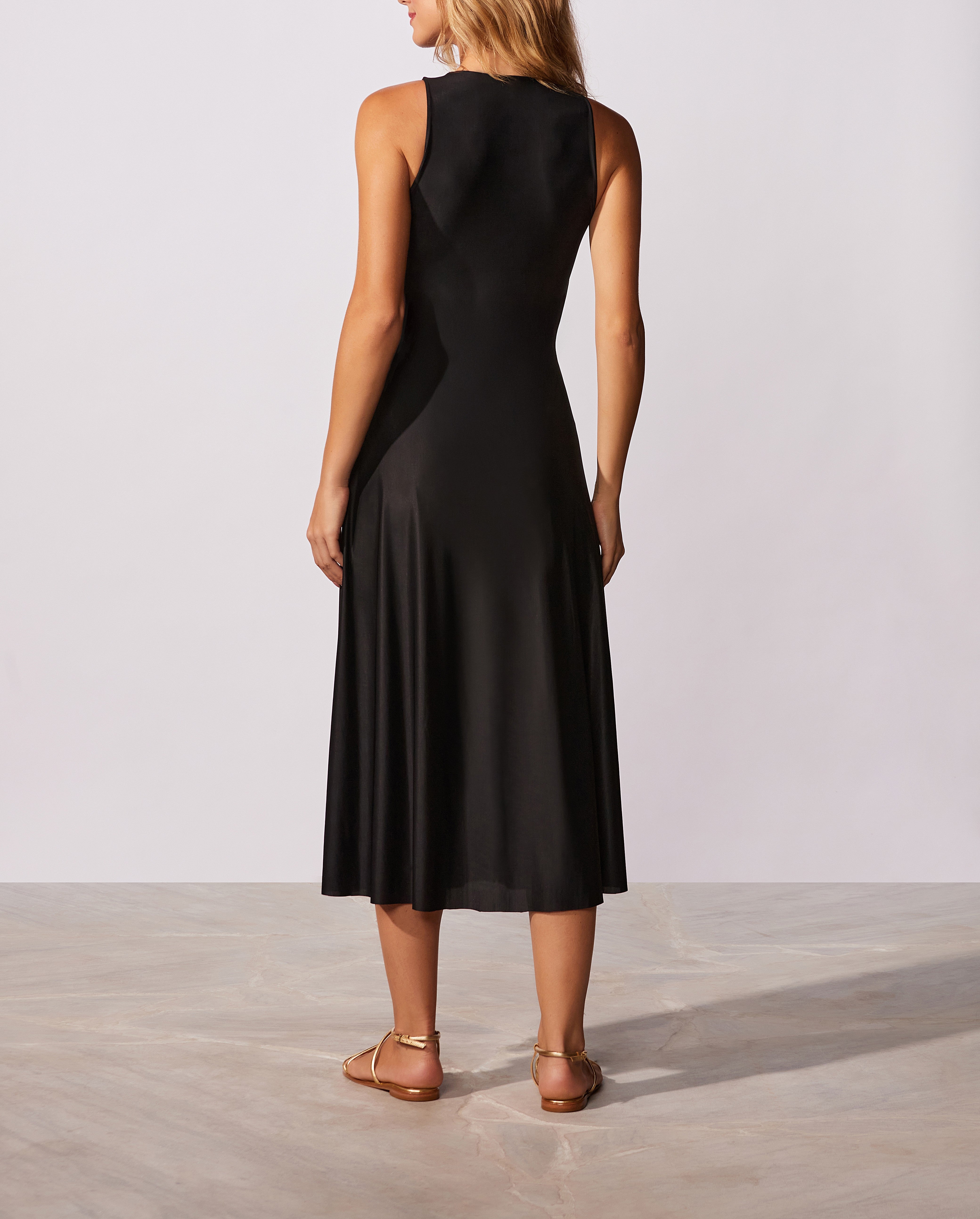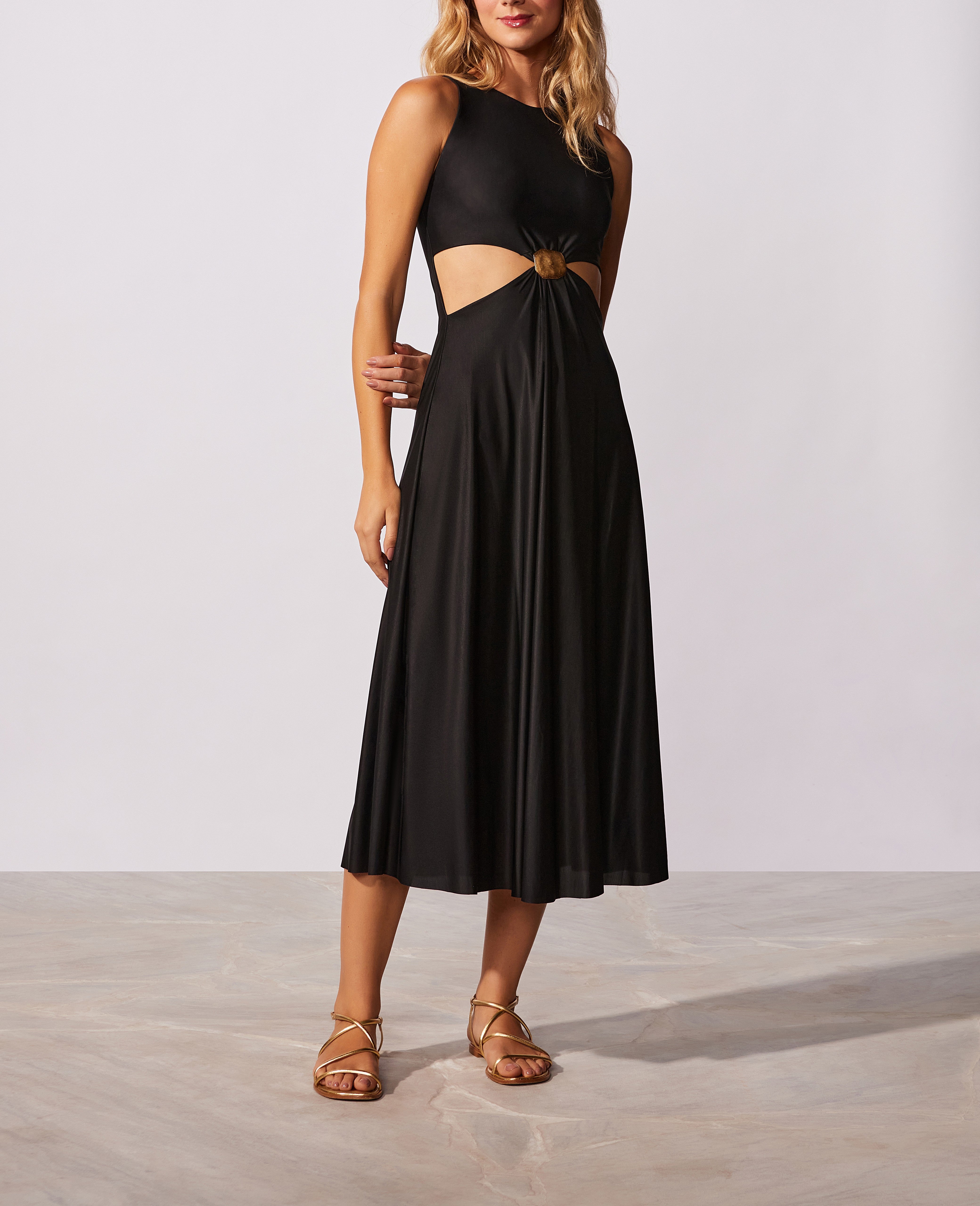 Vestido midiregata eva sê com recorte na cintura e detalhe de passante em metal no banho dourado