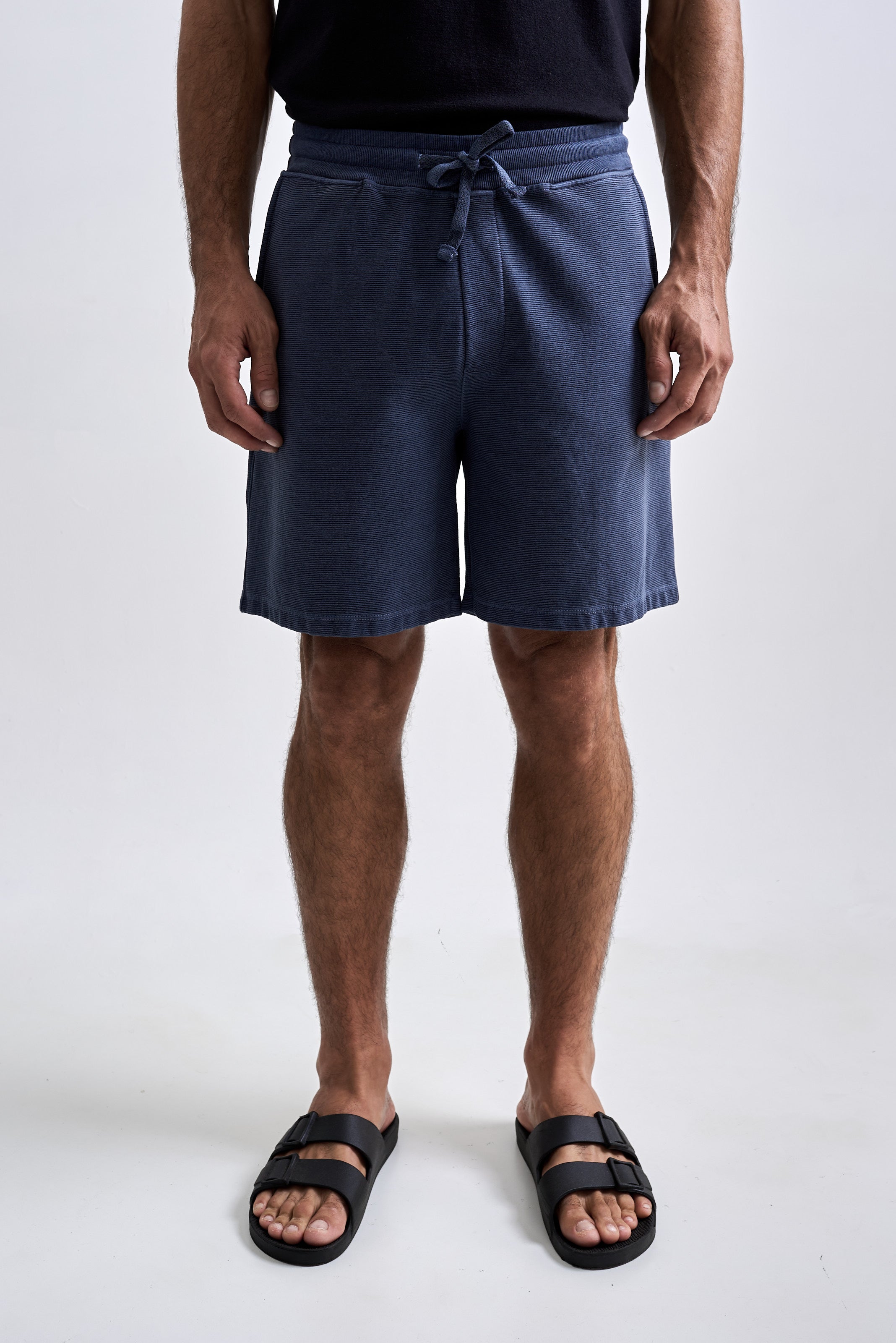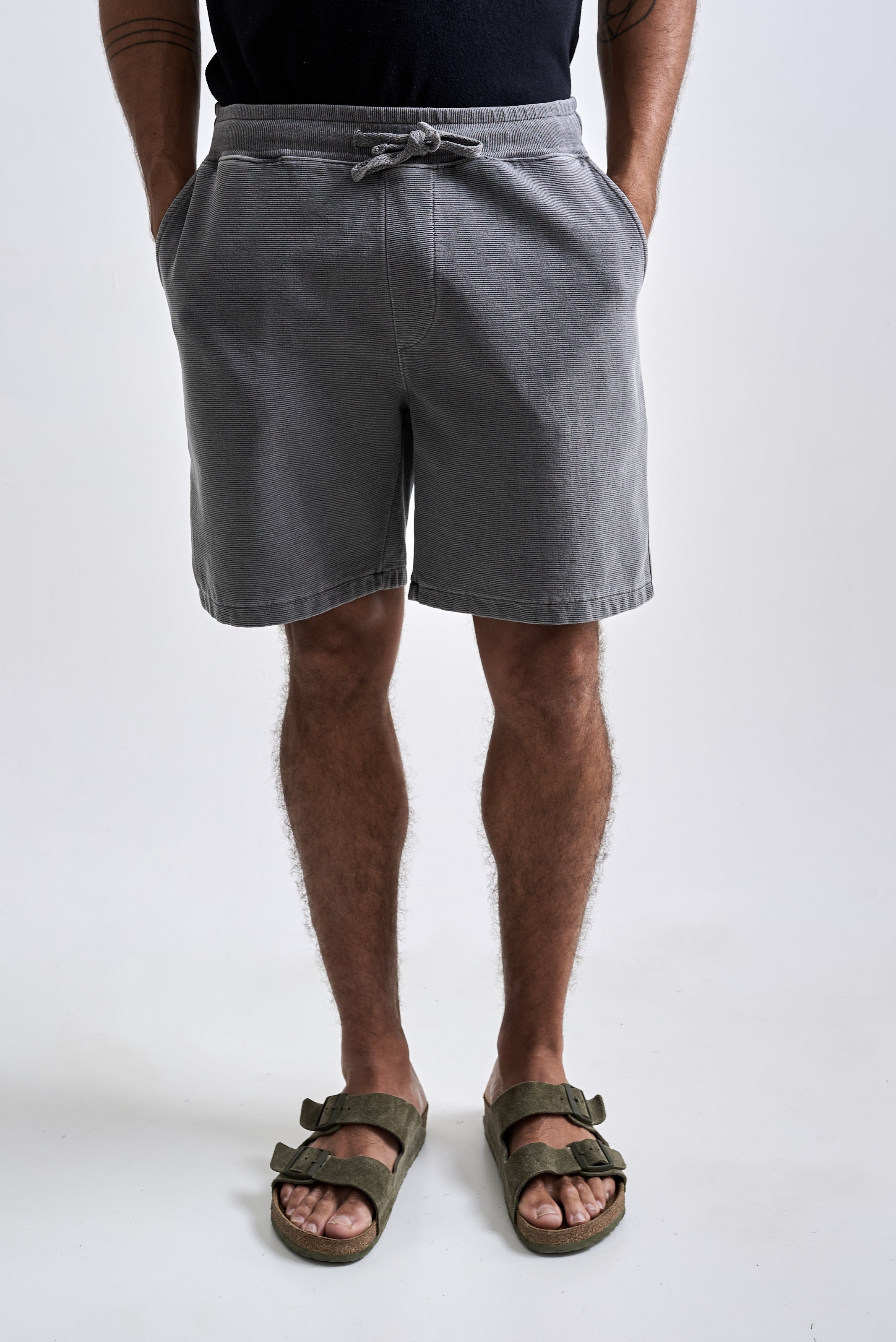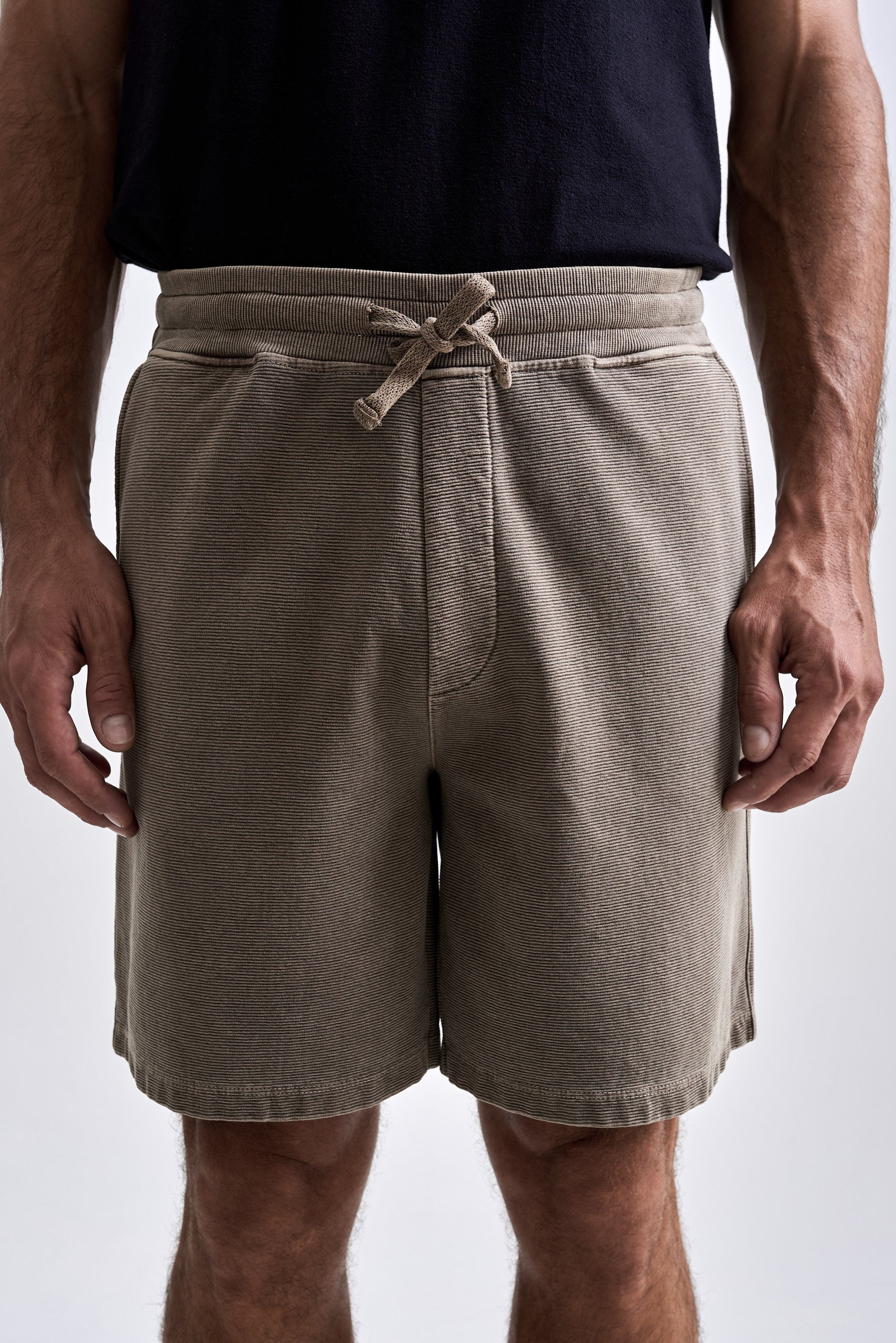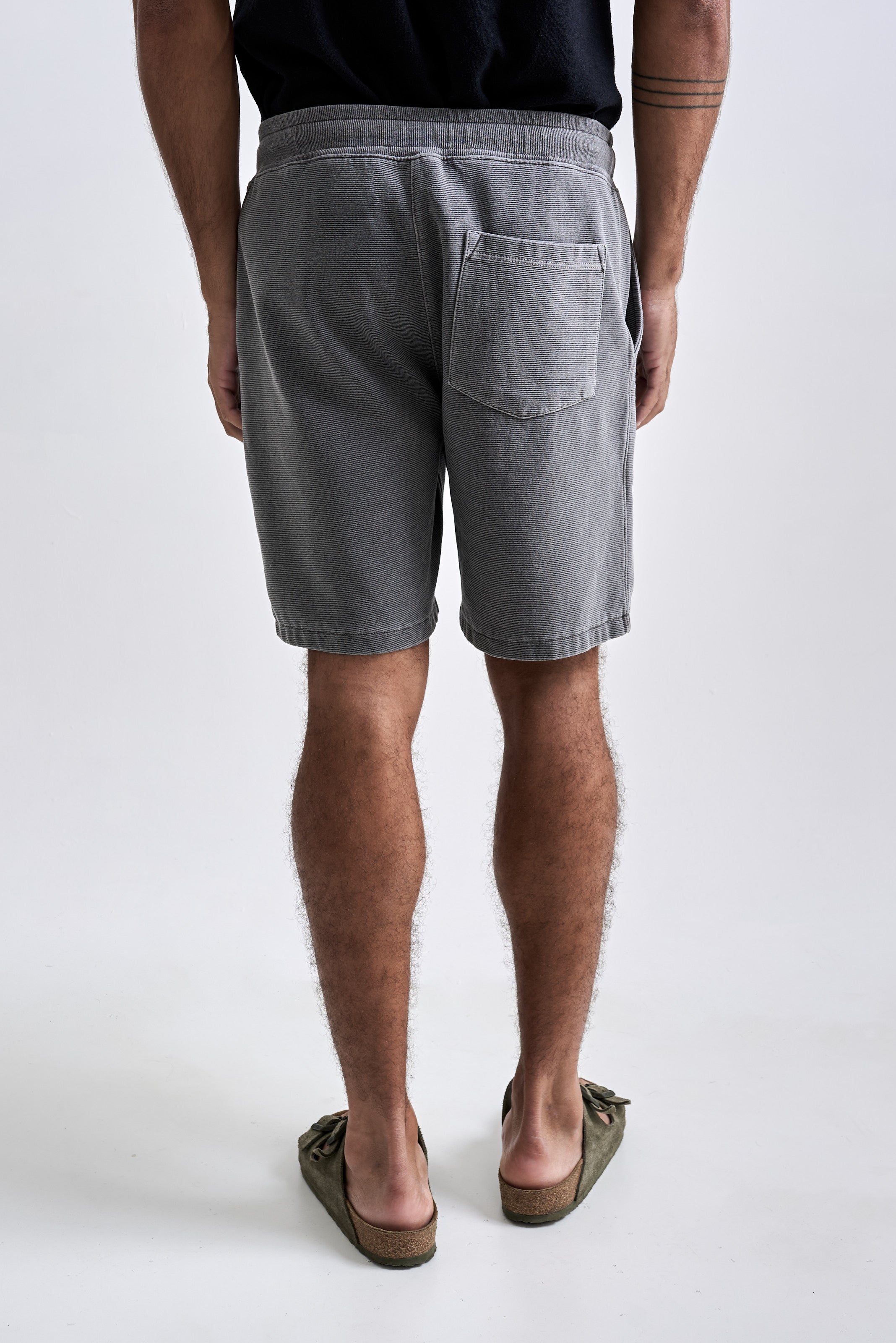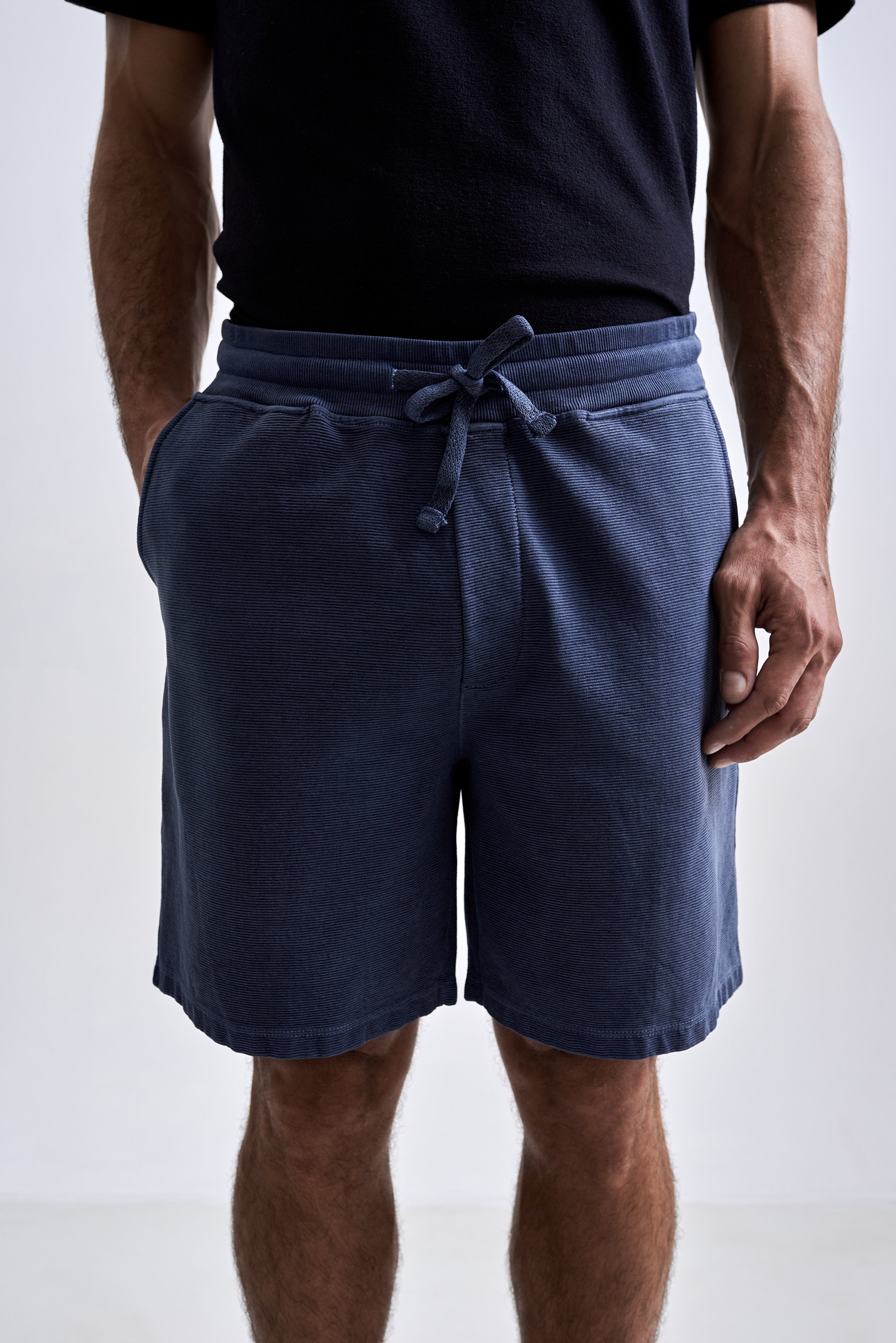 A Bermuda Neblina foi desenvolvida em tecido com textura de nervura, sem felpa interna e feita em 100% algodão penteado. O tingimento estonado reforça a textura do tecido. A peça tem modelagem regular e foi idealizada para proporcionar o máximo nível de c