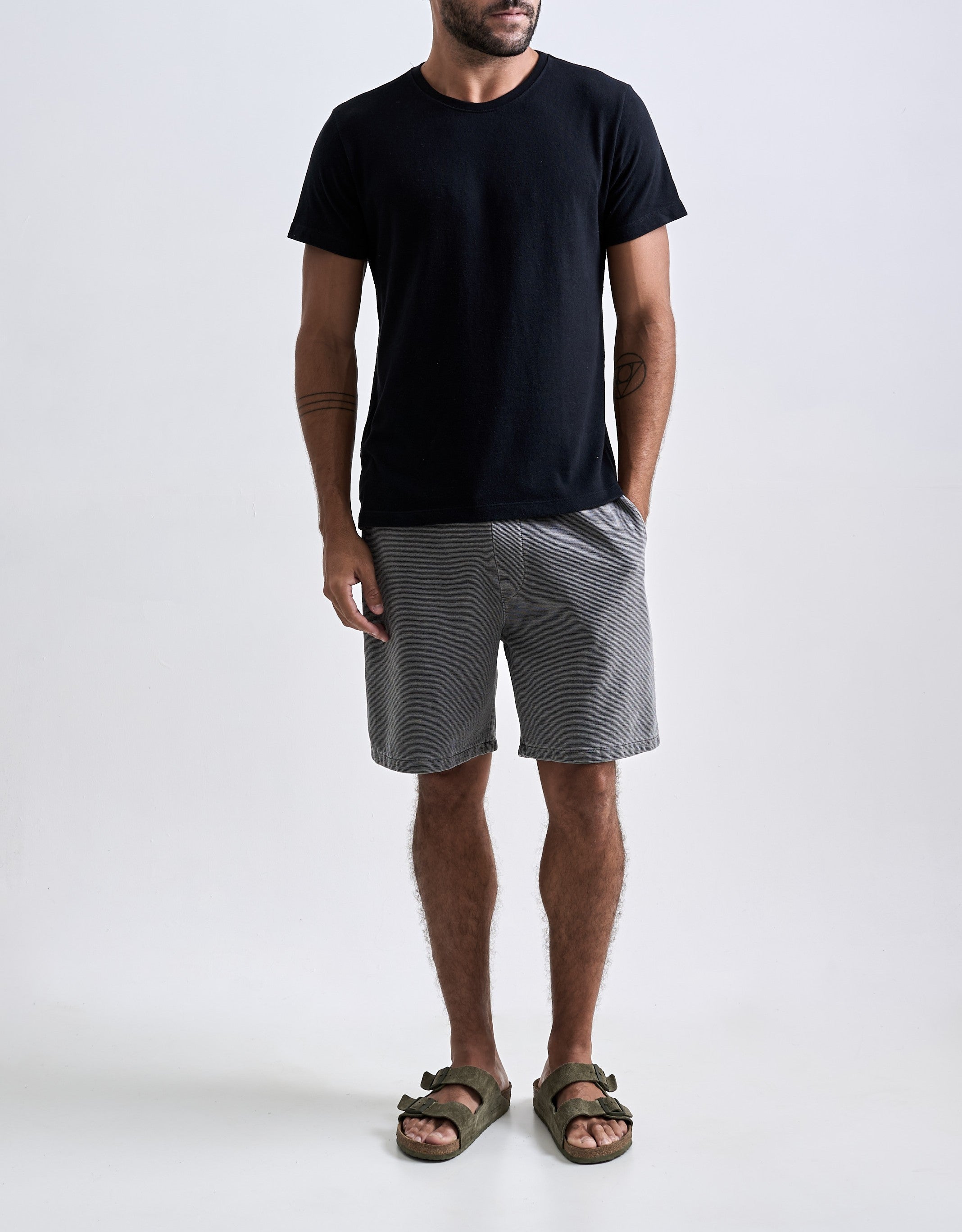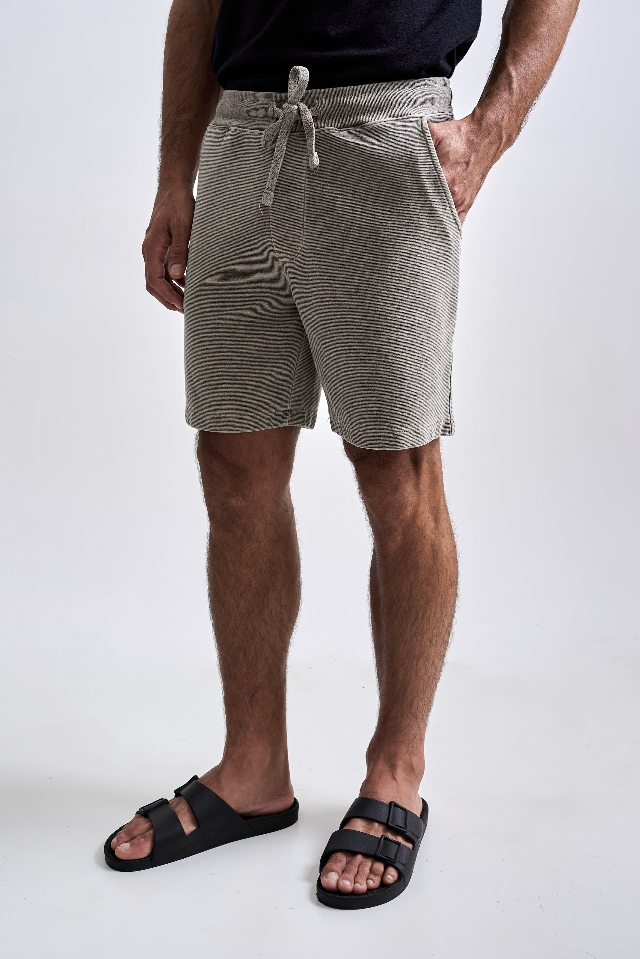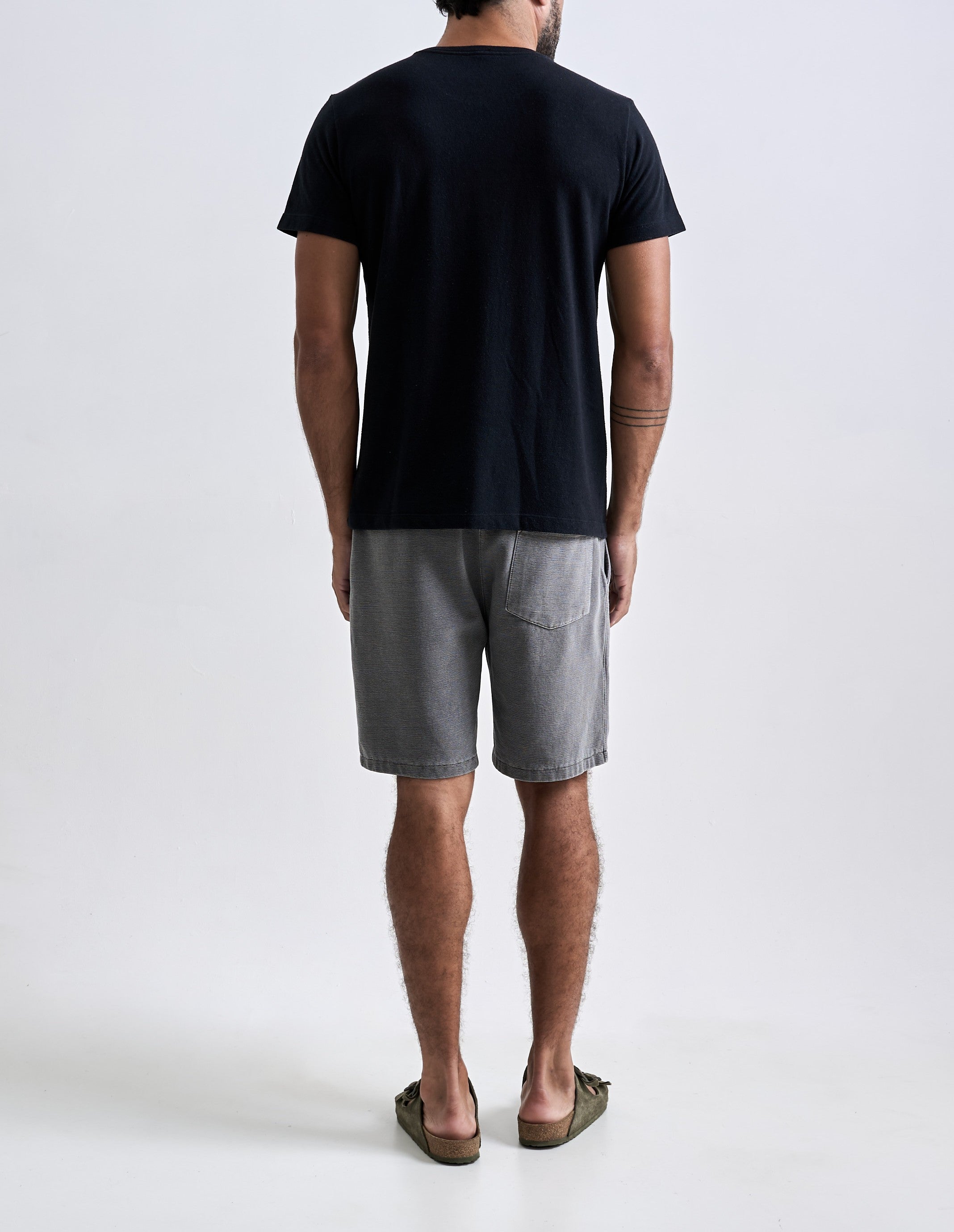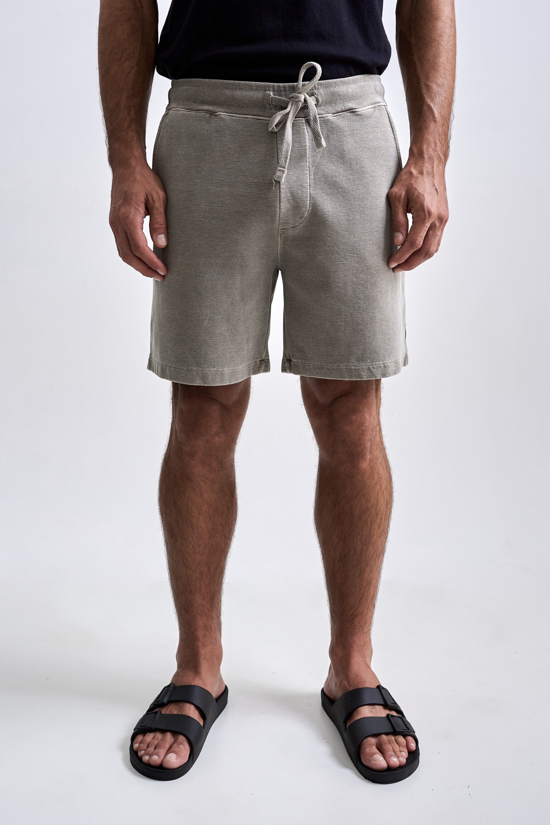 A Bermuda Neblina foi desenvolvida em tecido com textura de nervura, sem felpa interna e feita em 100% algodão penteado. O tingimento estonado reforça a textura do tecido. A peça tem modelagem regular e foi idealizada para proporcionar o máximo nível de c