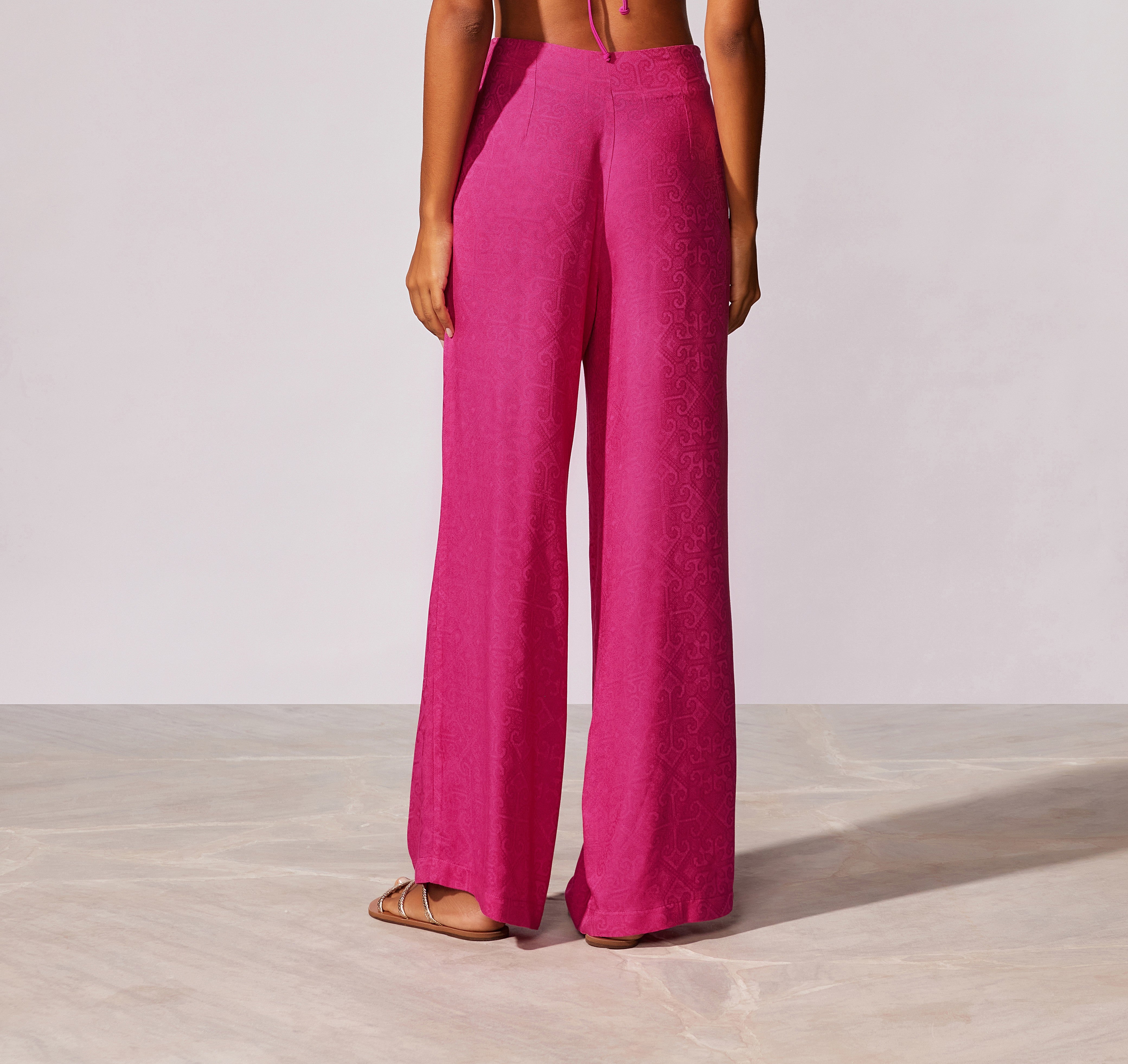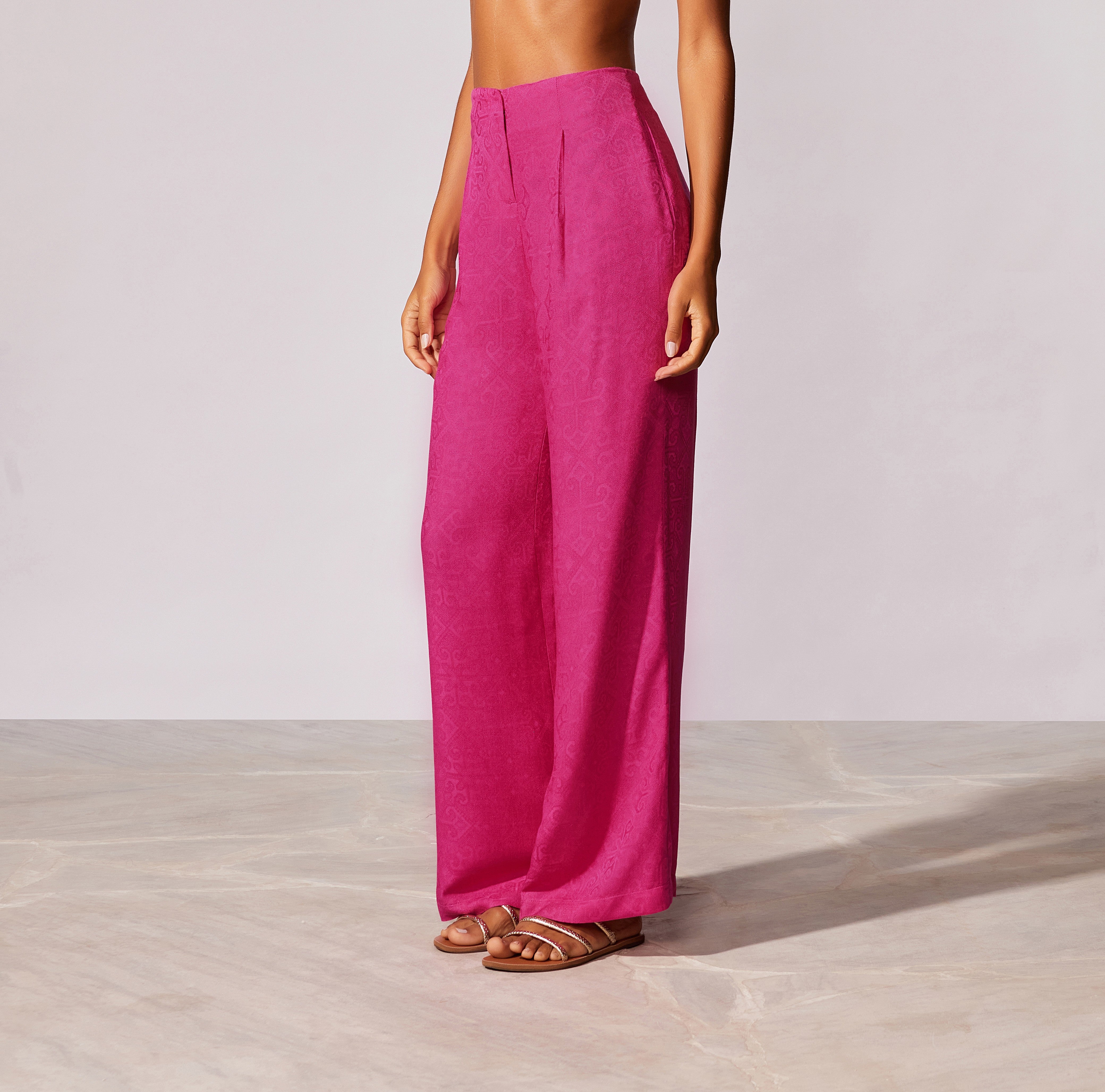 Calça lisa pantalona com pregas e bolsos laterais