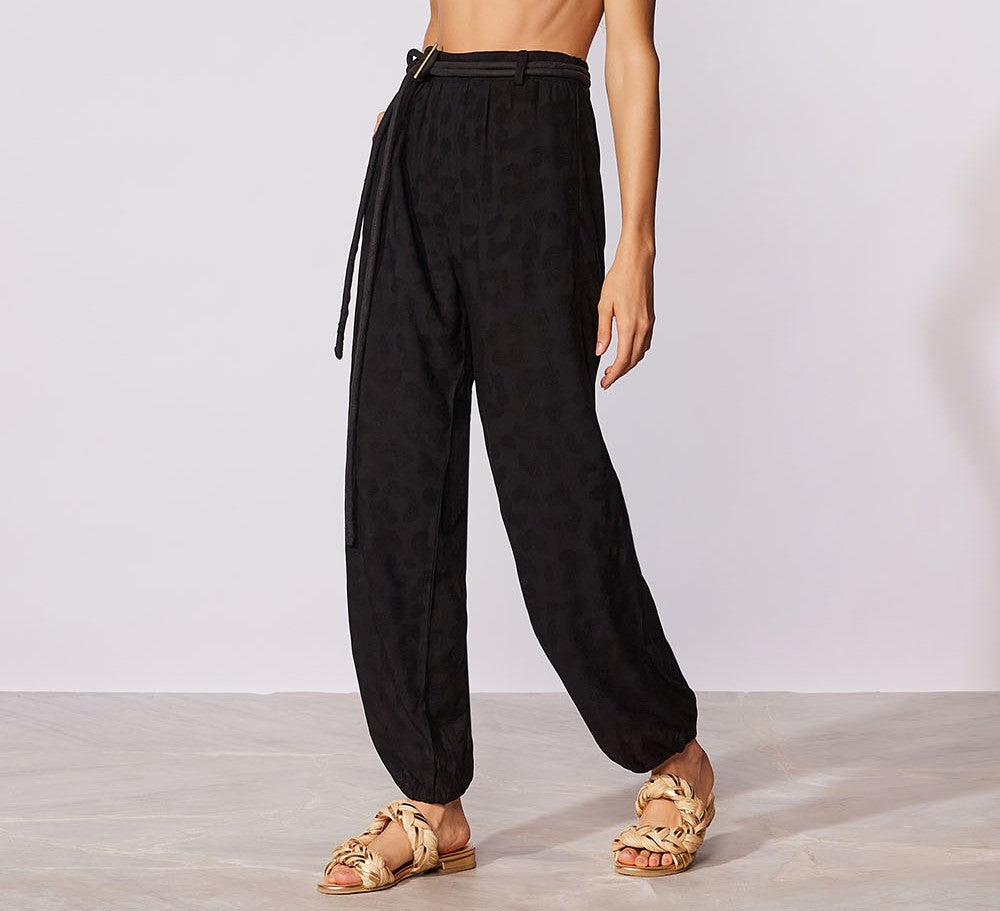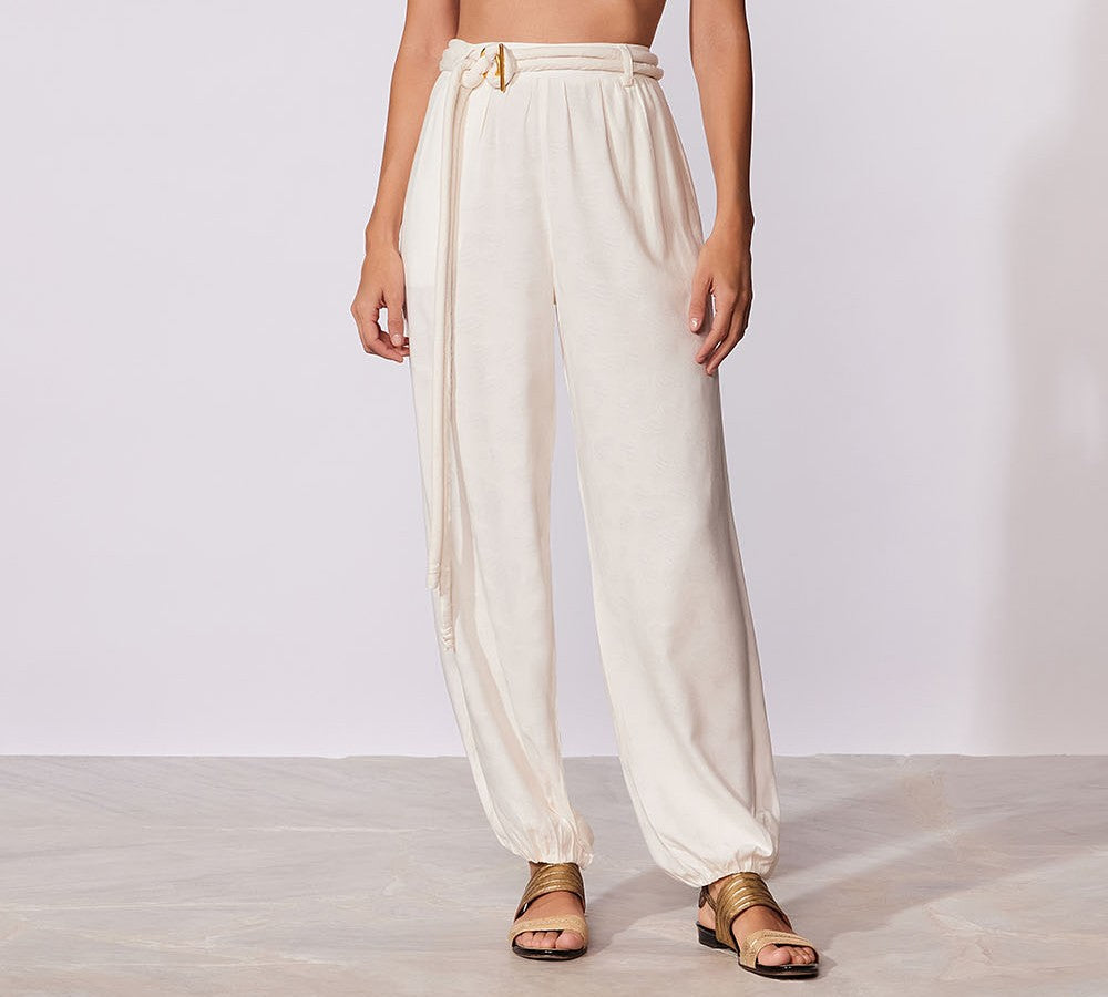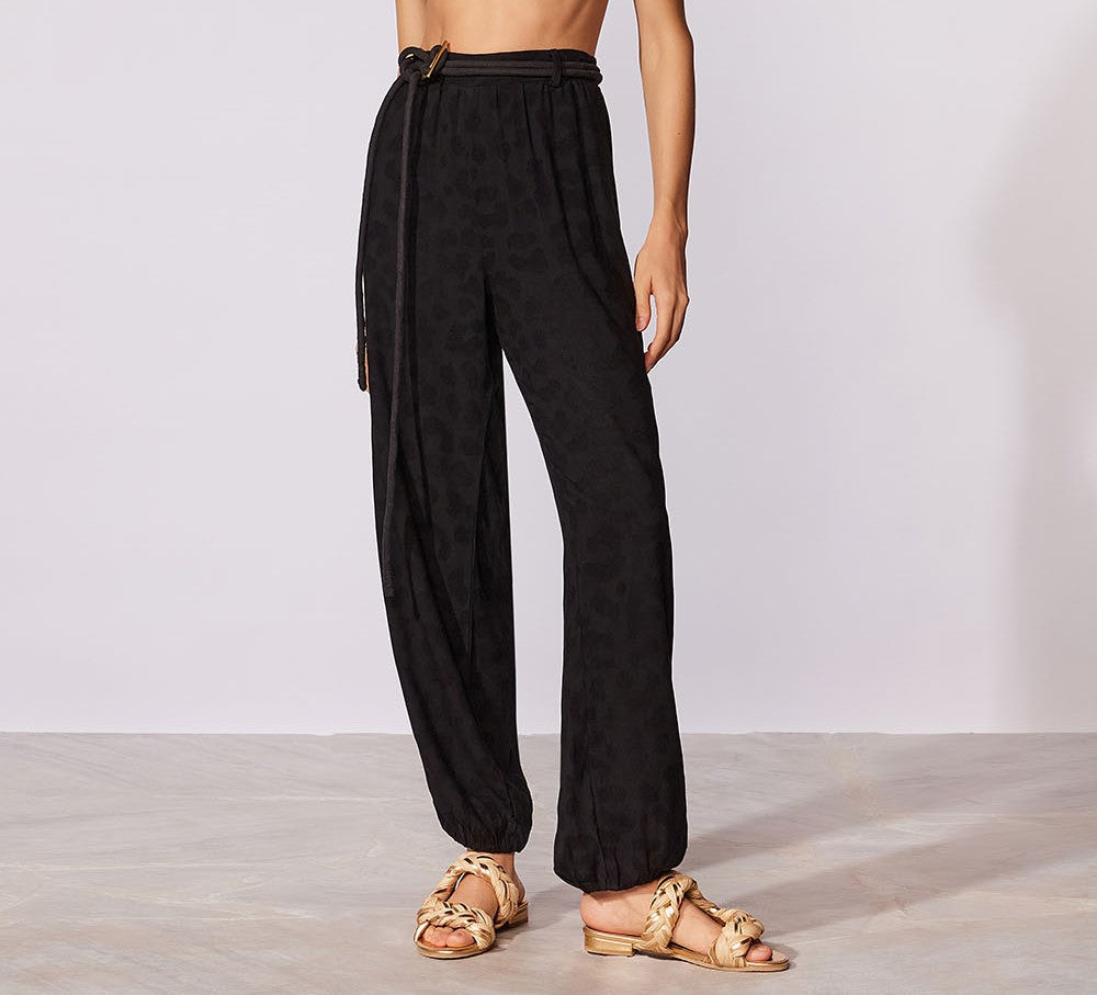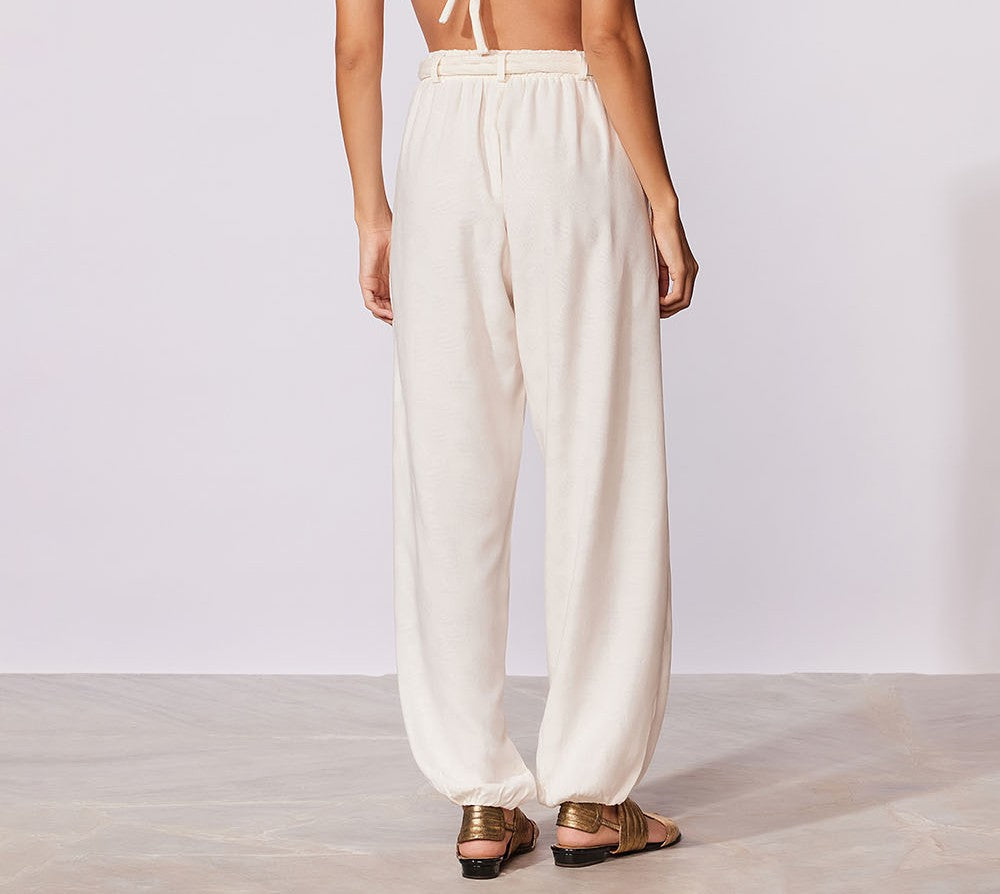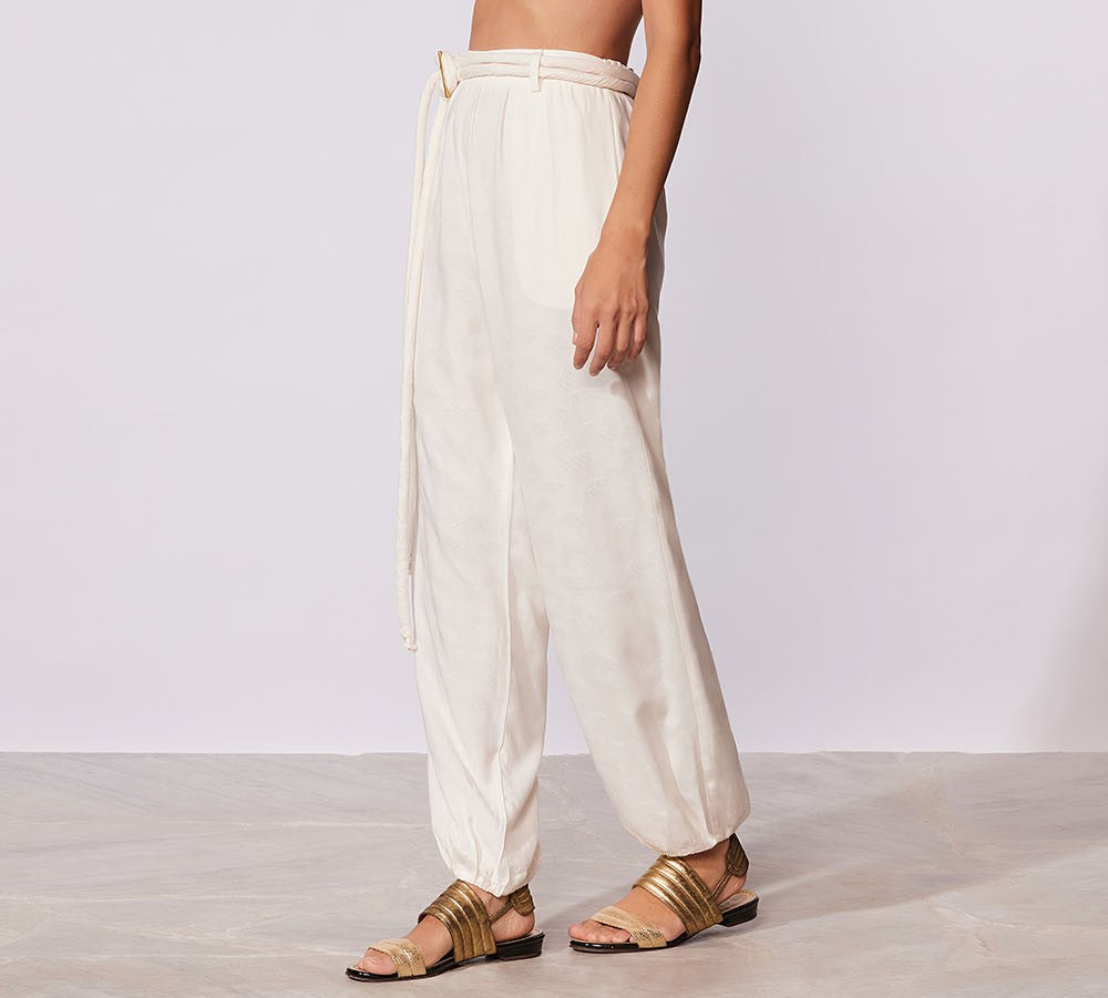 Calça em tecido trabalhado, cós e punho de elástico, acompanha cinto de cotrdão com detalhe de aviamento
