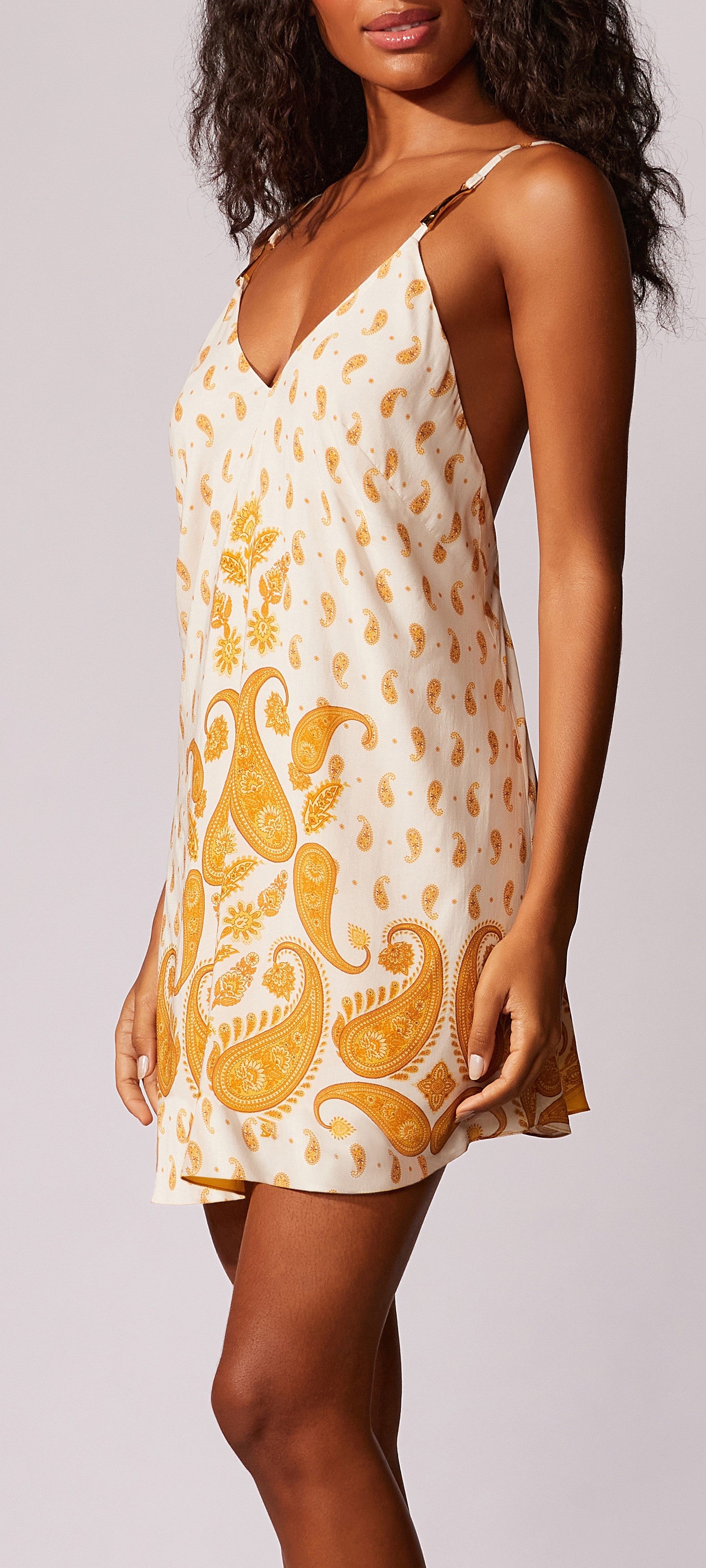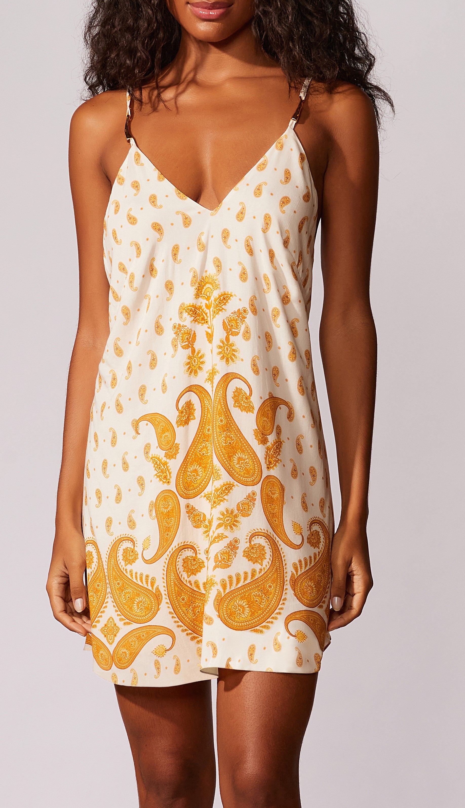 Vestido curto estampado localizado, decote V, com alças finas reguláveis e aviamento de metal