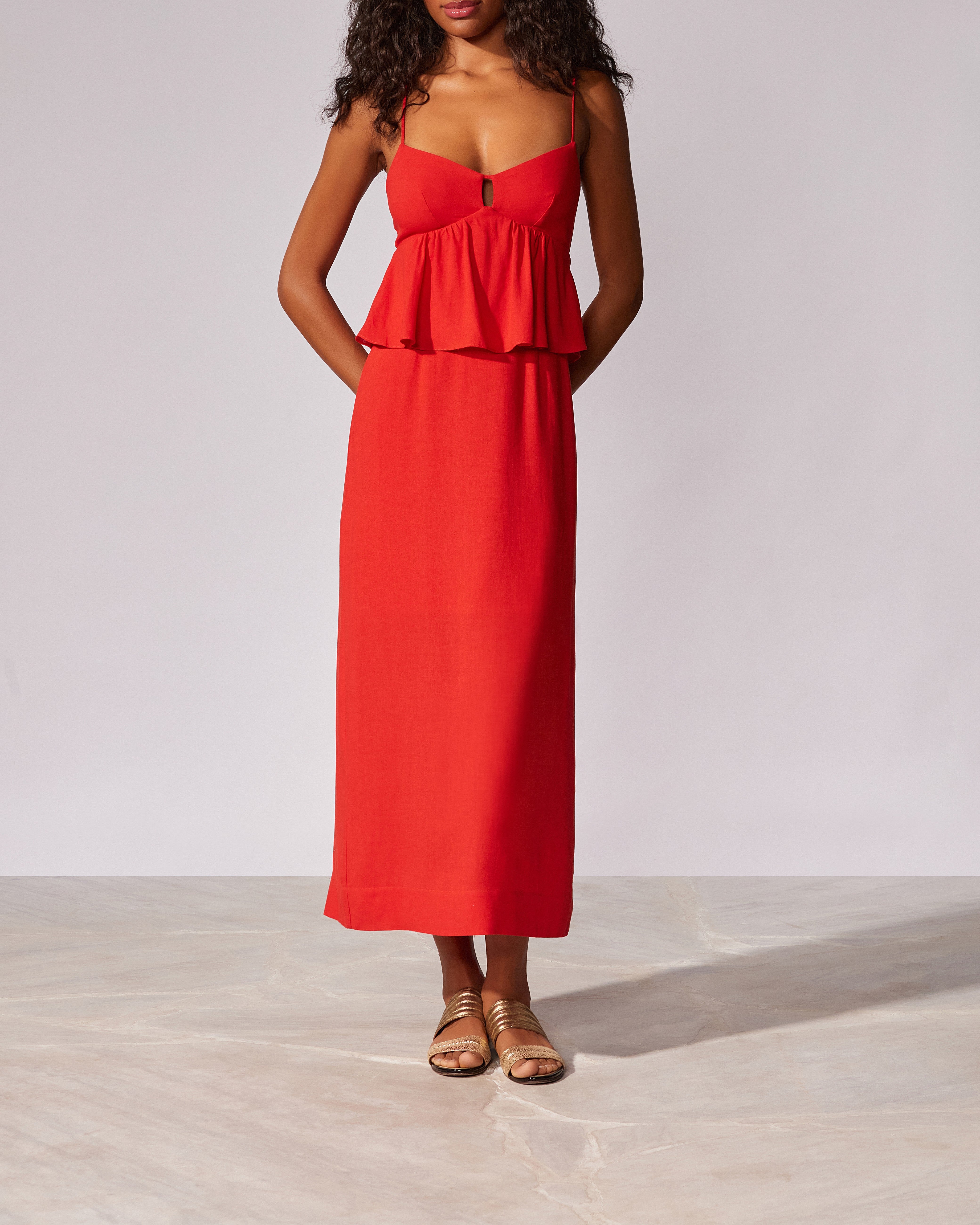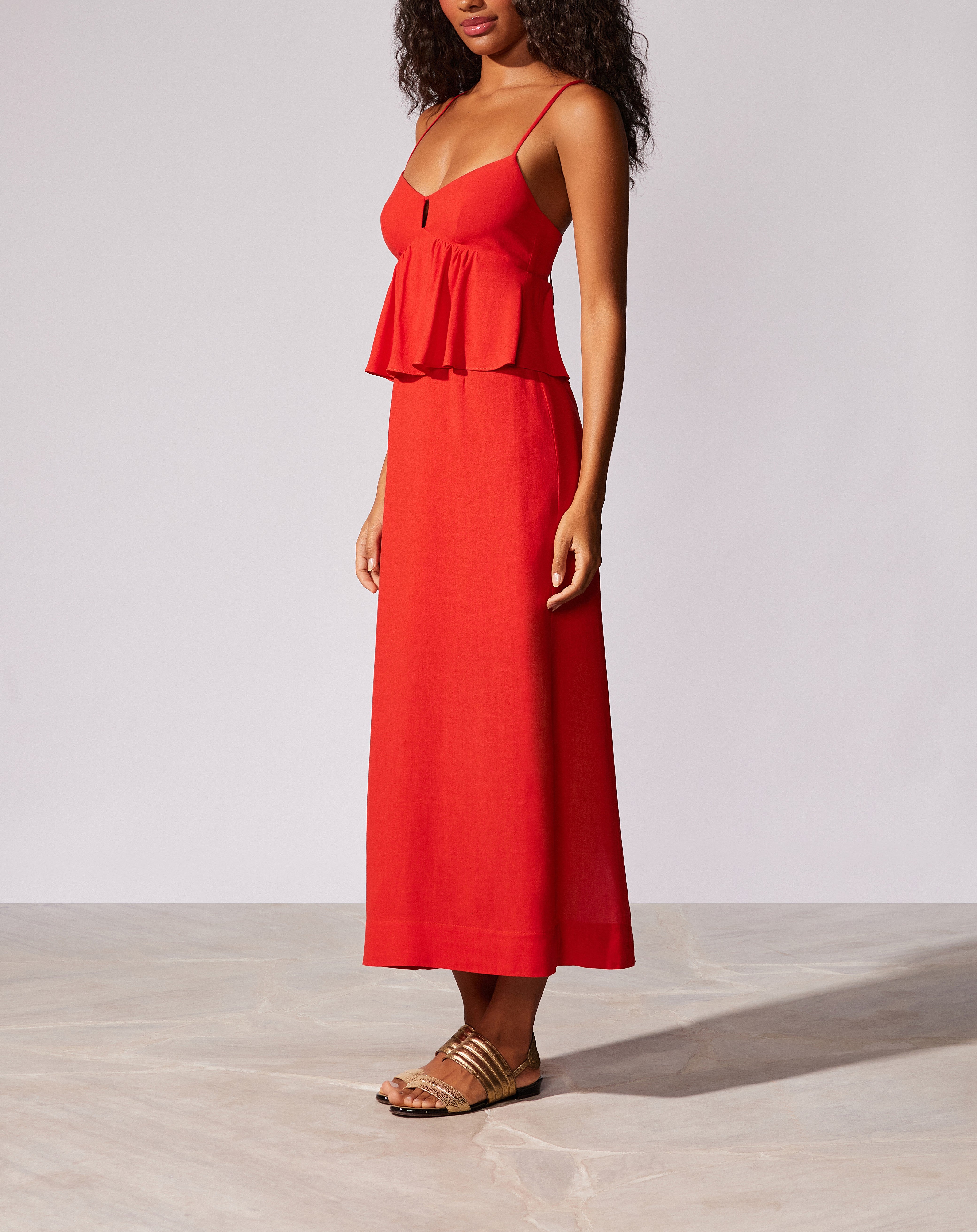 Vestido midi liso com detalhe de babado no busto, alças reguláveis, e zíper invisível com lastex nas costas