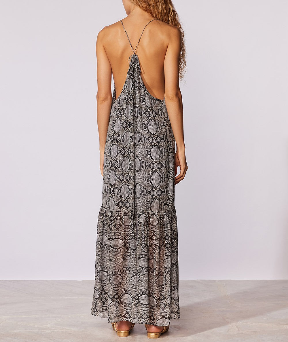 Vestido estampado com forro de tule, alças finas cruzadas nas costas e detalhe de babado na barra