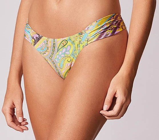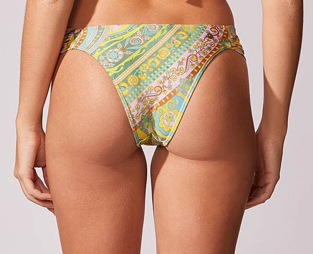 Tanga fio duplo estampada cava alta e cobertura pequena, possui recorte central. Detalhe de logo no banho ouro velho nas costas