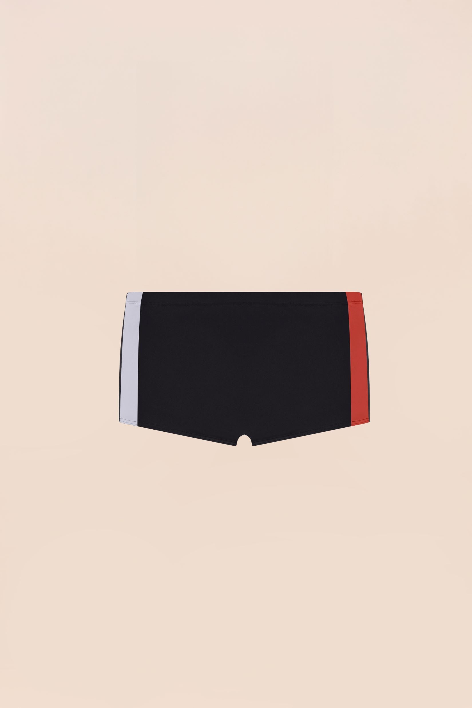 Plain swim trunks with colorful side cutouts and a drawstring waist for adjustment. This piece includes a lining for comfort and support.