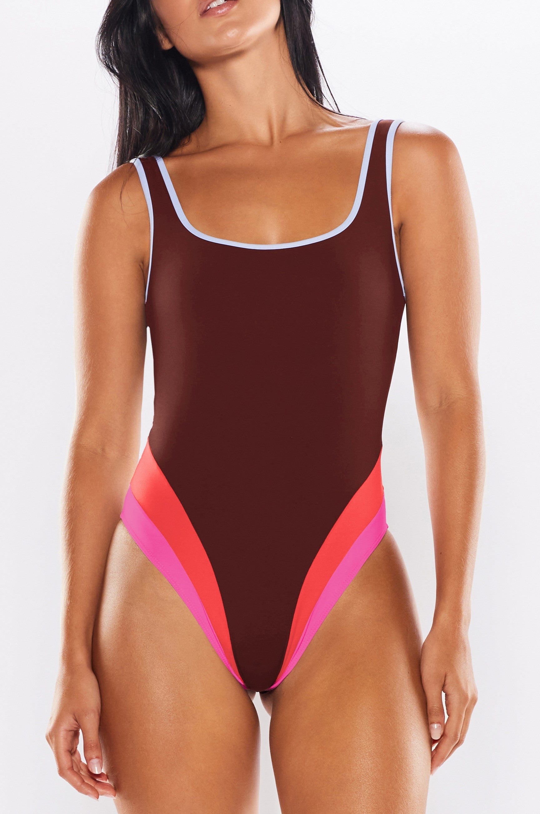 Maio alça reta com recortes em cores contrastantes, decote quadrado e costas abertas.