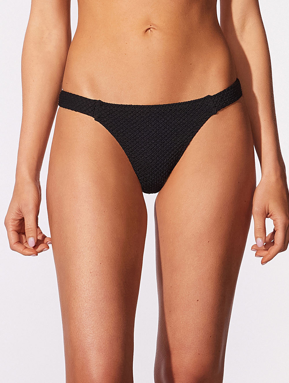 Tanga Lisa com recortes de elástico nas laterais e na frente e costura em zig zag por toda a peça. Detalhe de metal em ouro fosco nas costas