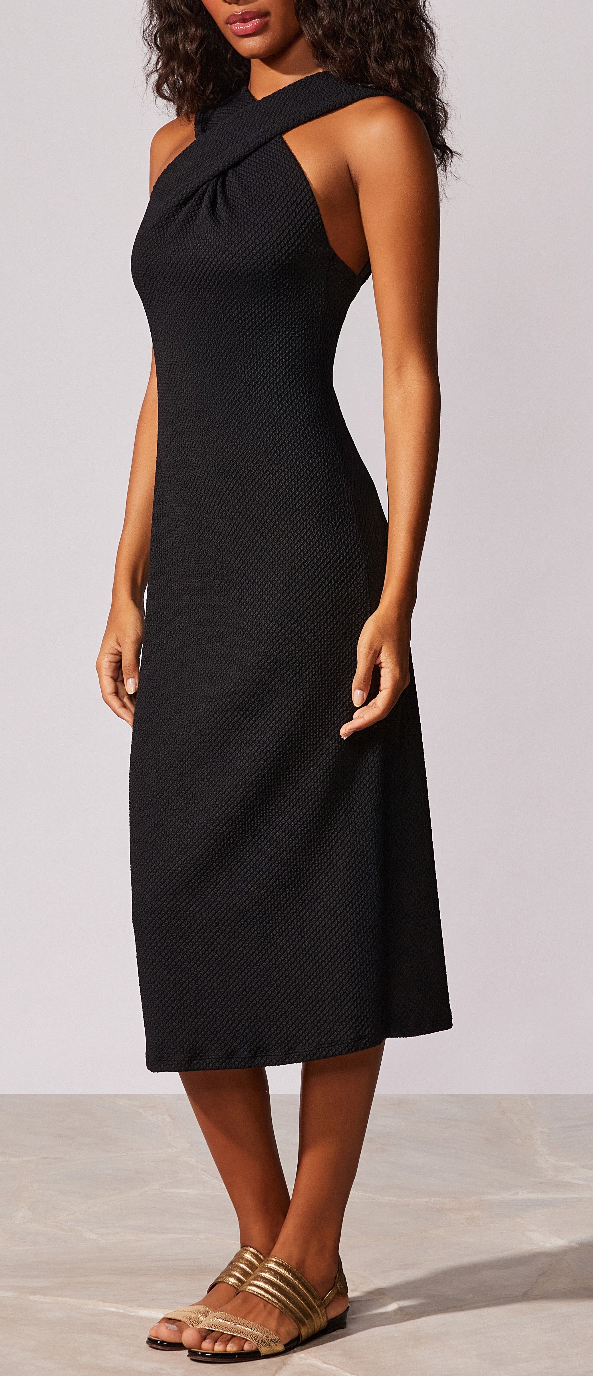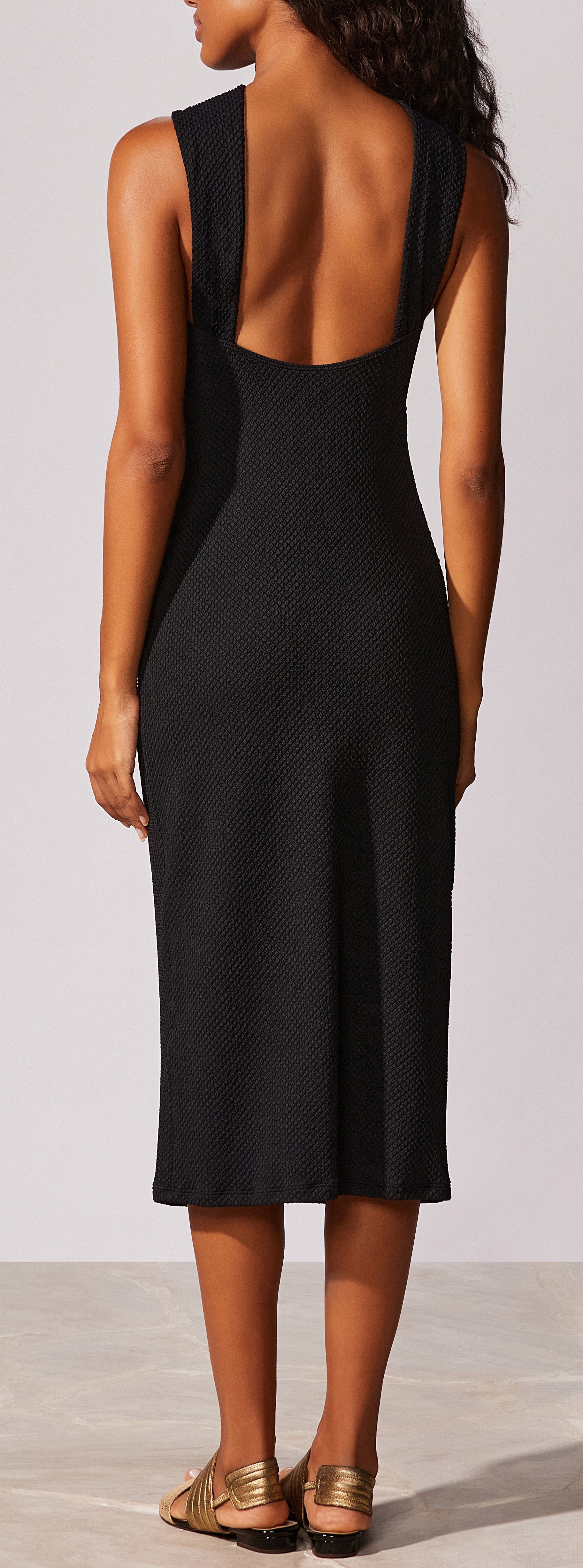 Vestido midi textura liso estilo frente única, com alças largas paralelas nas costas