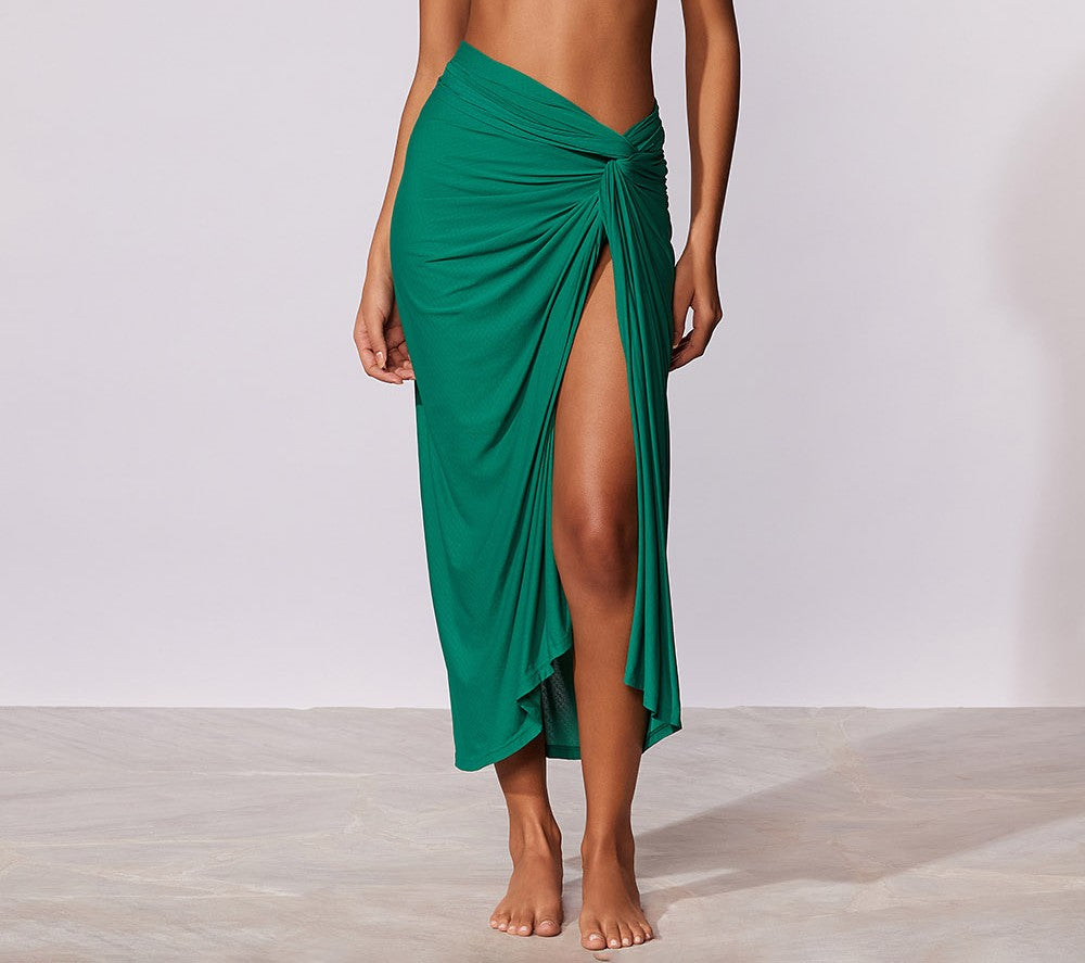 Canga lisa pode ser usada de diversas maneiras no corpo ou somente na cintura.