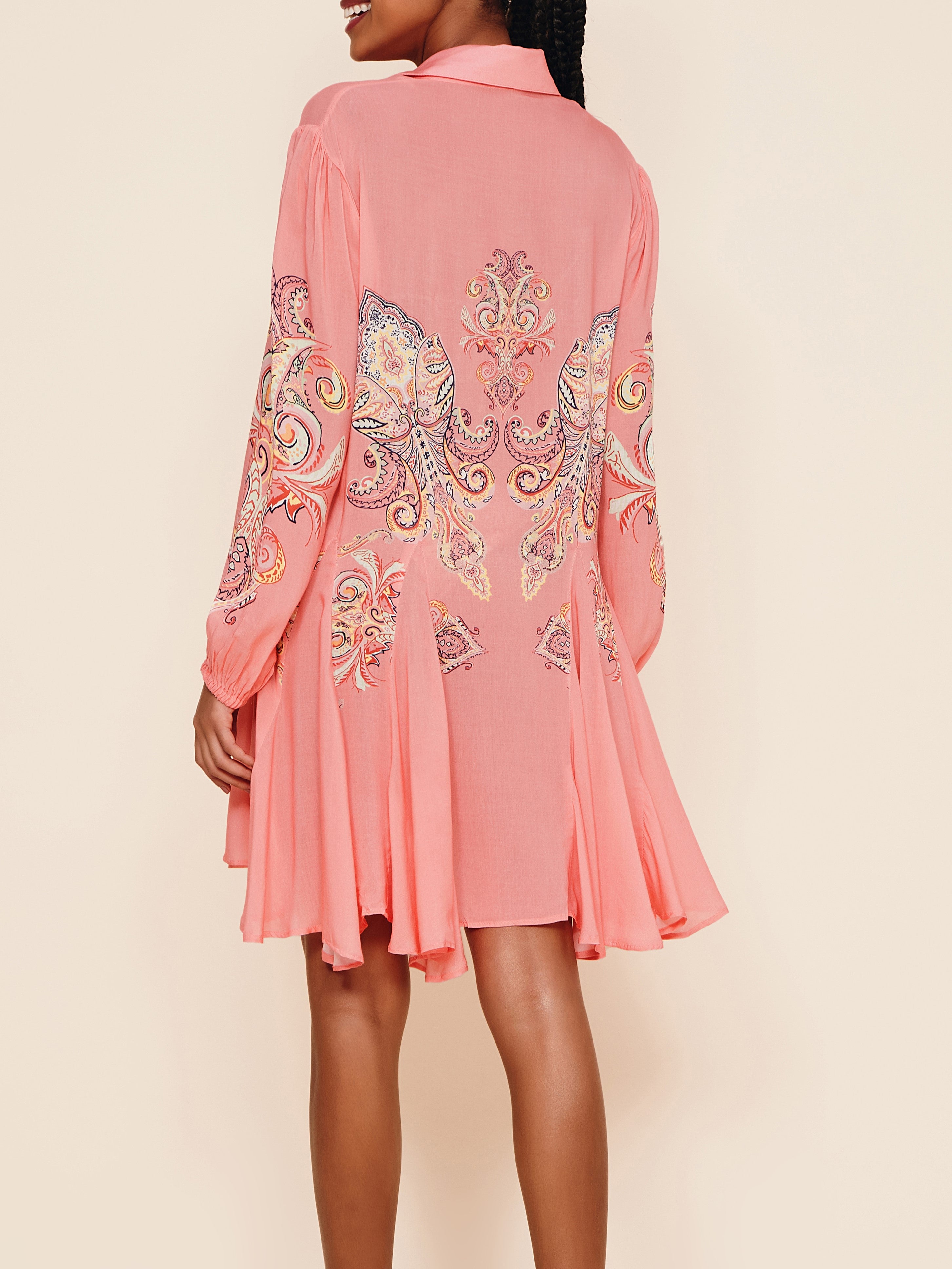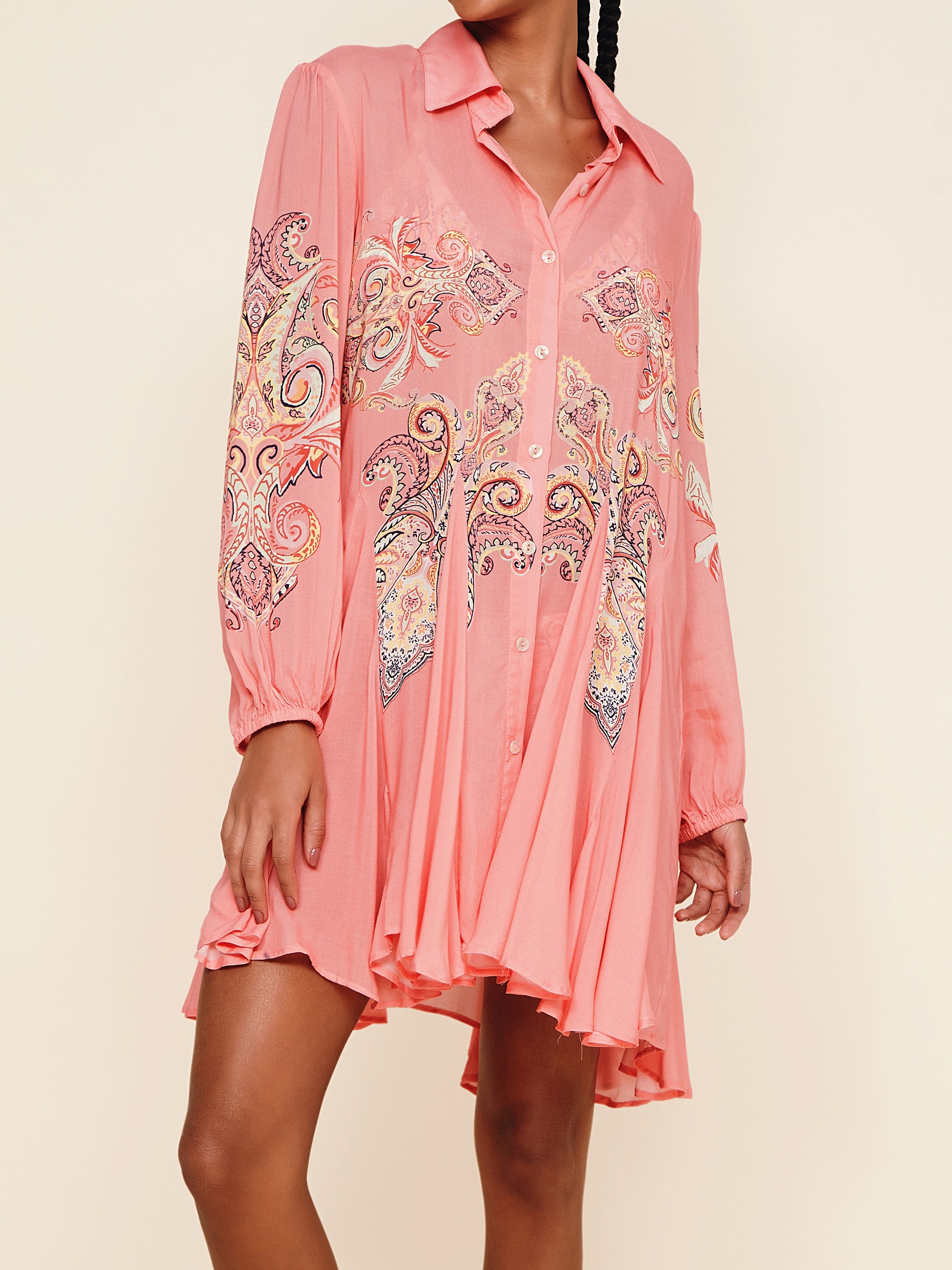 Short A-line shirt dress in voile with localized print. Features puff sleeves and front button closure in shirt style.