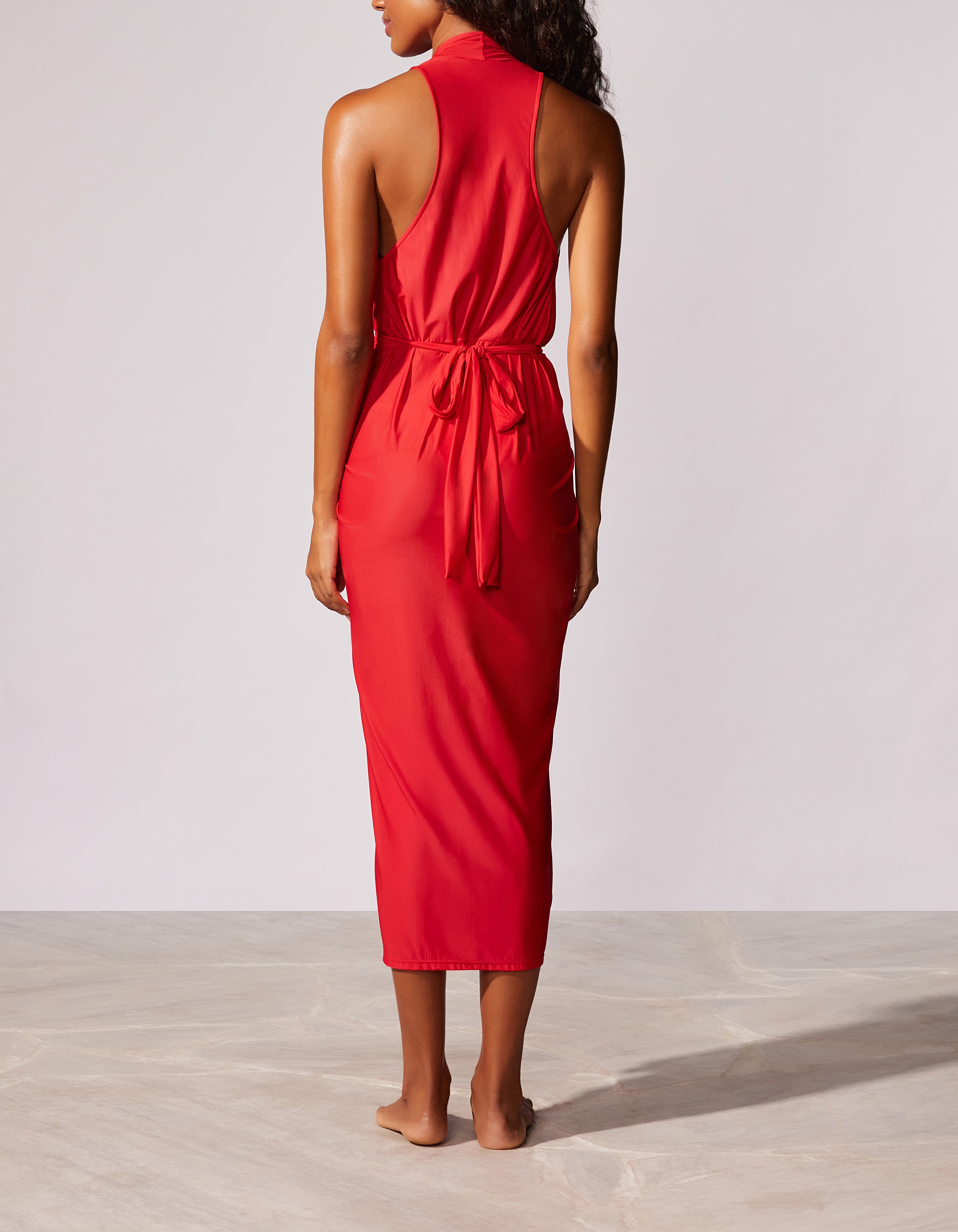 Vestido midi liso regata liso com decote V, faixa para transpasse e ajuste na cintura