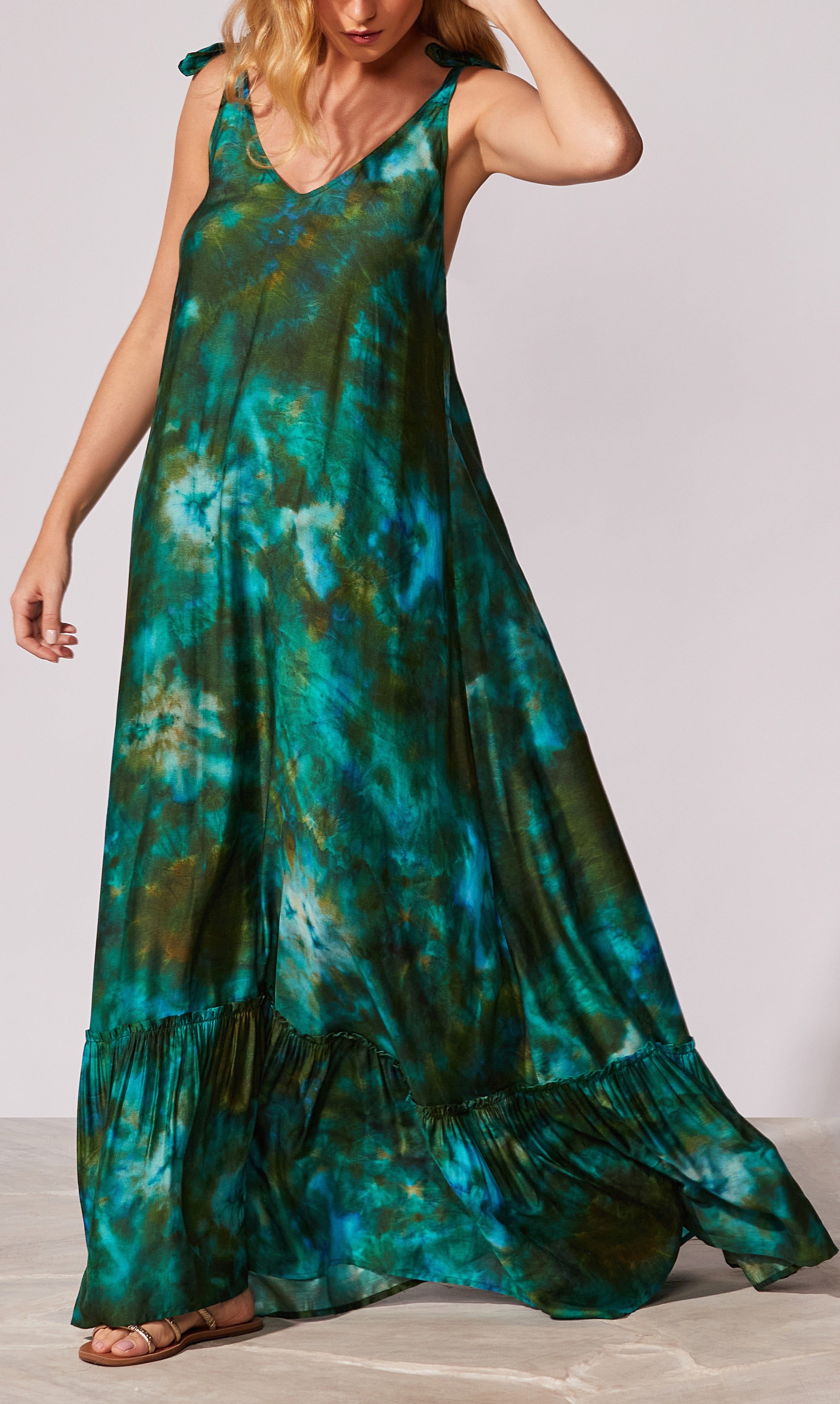 Vestido longo estampado com detalhe de amarração nas alças