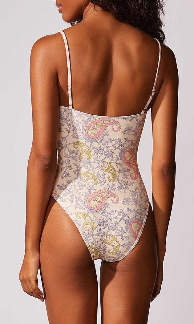 Maiô básico estampado decote em V, detalhe de costura zig zag , com detalhe de aviamento de metal no banho ouro velho nas alças e regulagem. Bojo removível