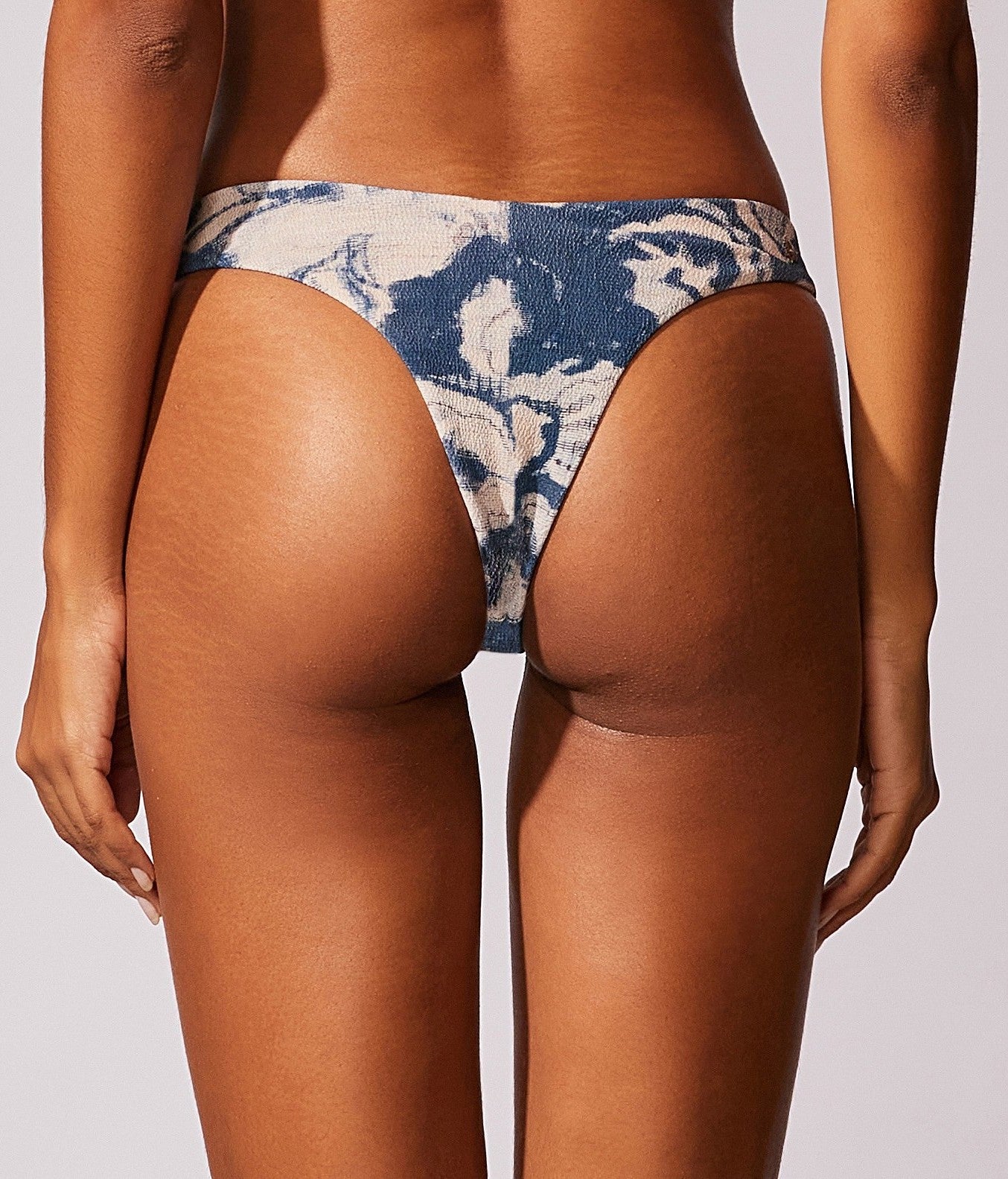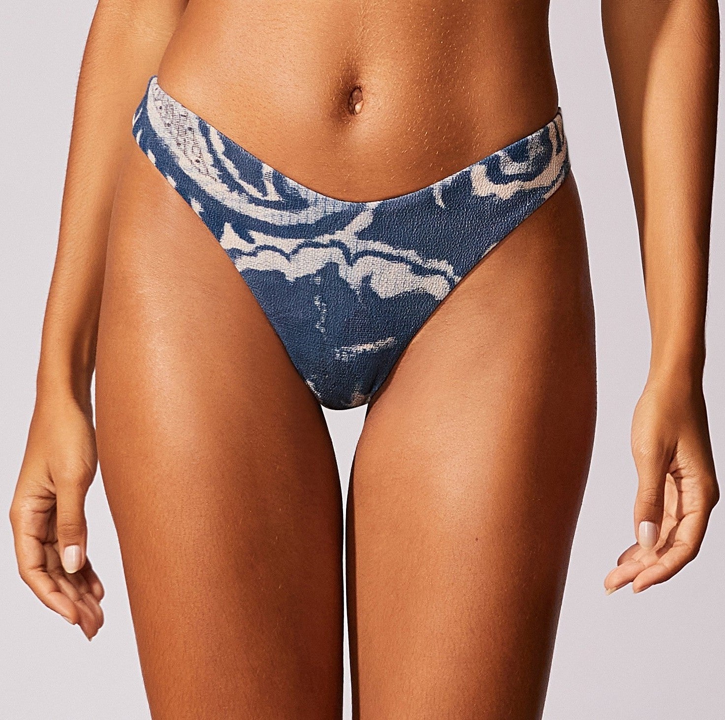 Tanga asa delta estampada cava alta e cobertura pequena. Detalhe de logo no banho dourado nas costas