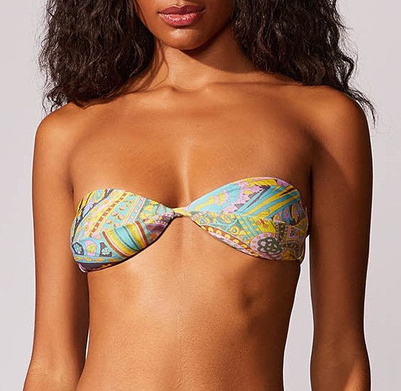 Top tomara que caia estampado com recorte central no busto e fecho de imã nas costas no banho ouro velho. Bojo removível