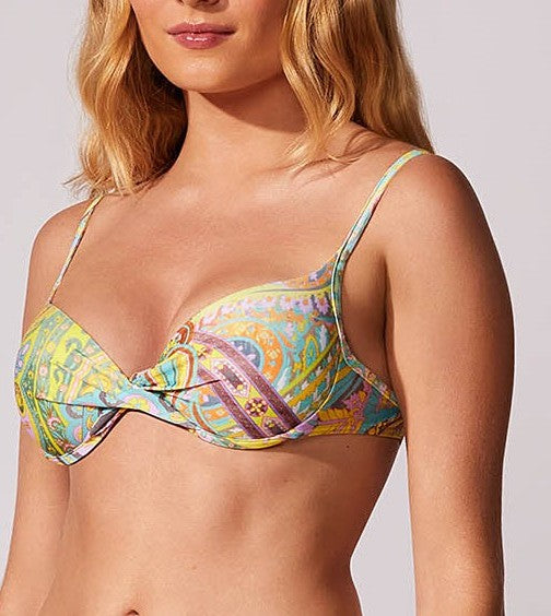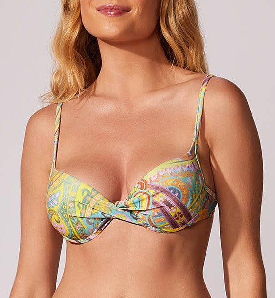 Top meia taça estampado com decote transpassado, alças fixas com regulagem. Peça possui um aro para maior sustentação e amarração nas costas. Bojo Fixo