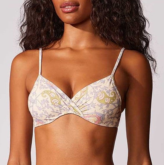 Top meia taça estampado alças fixas com regulagem, aro para maior sustentação e detalhe transpassado na frente com leve franzido. Peça possui amarração nas costas e aviamentos no banho Ouro Velho. Bojo removível.