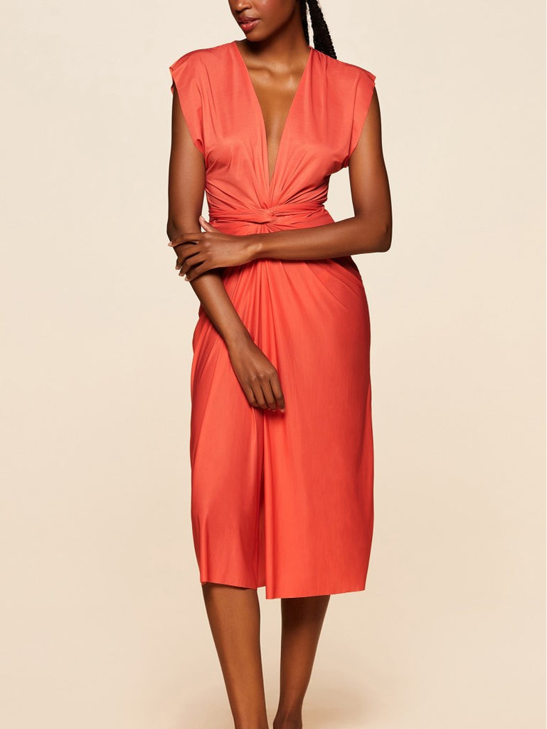 Vestido midi liso con escote en pico, mangas japonesas, cinturón cruzado y cintura ajustable.