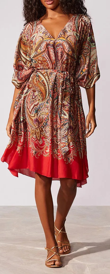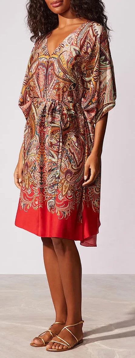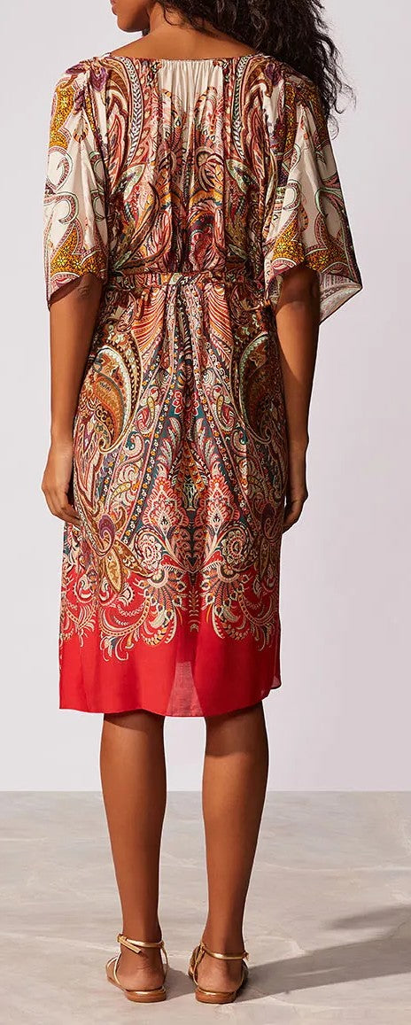 Kaftan estampado curto. O modelo possui decote em V com botão encapado e estampa localizada.
