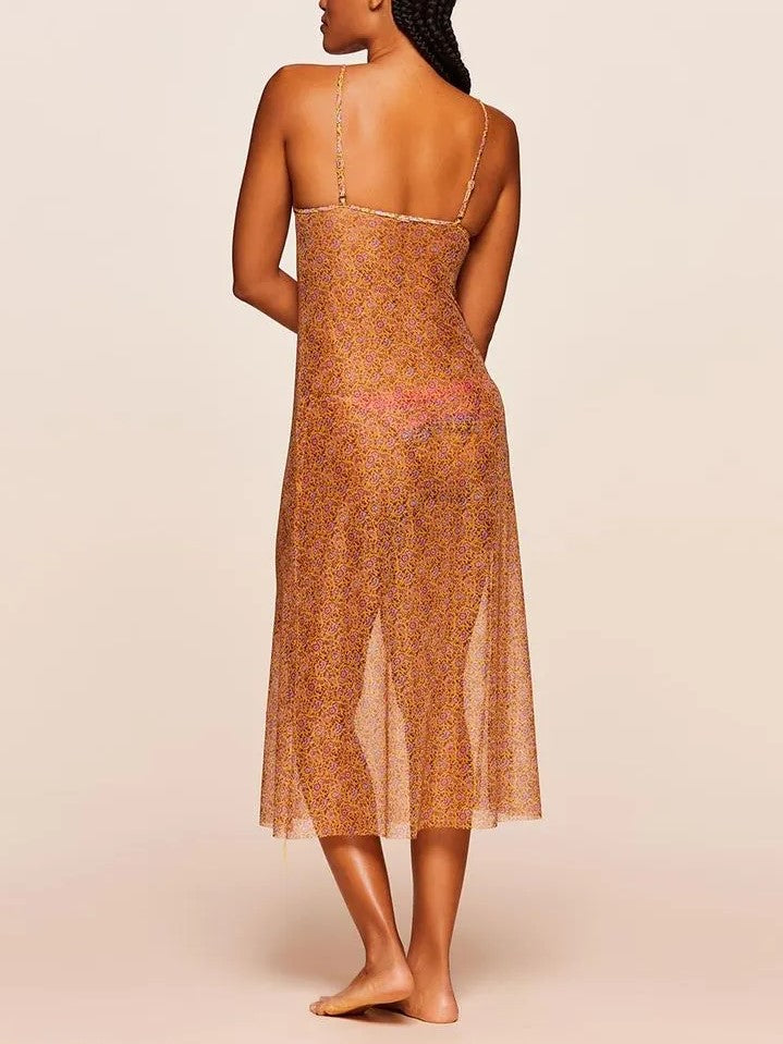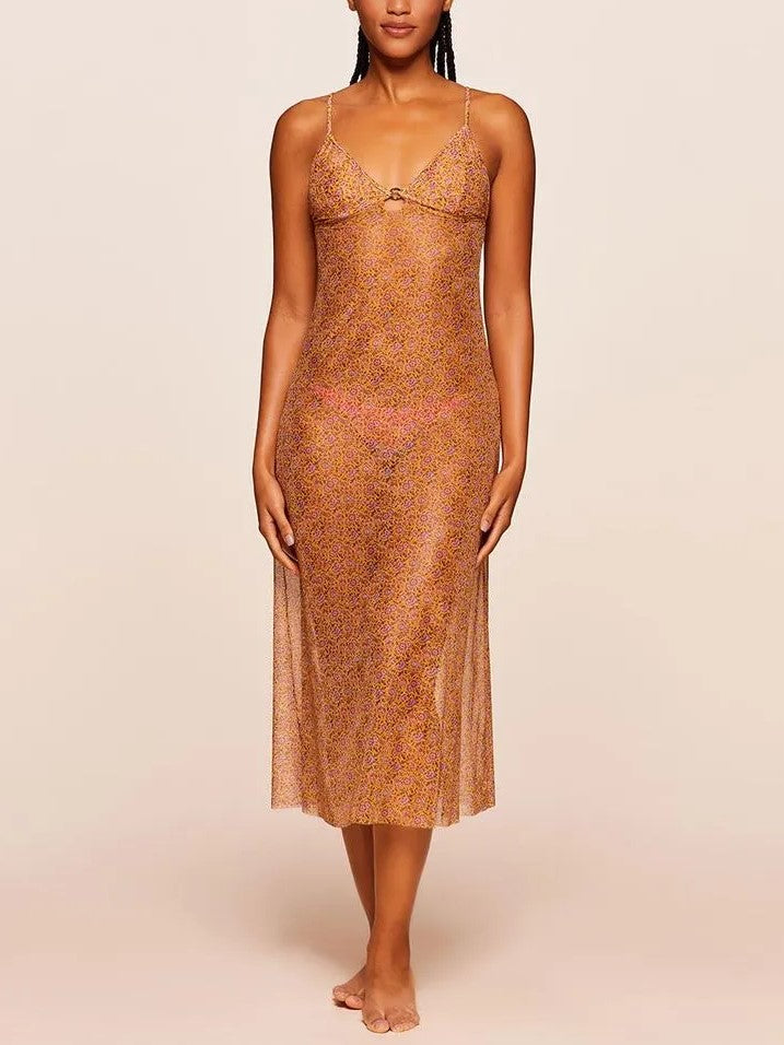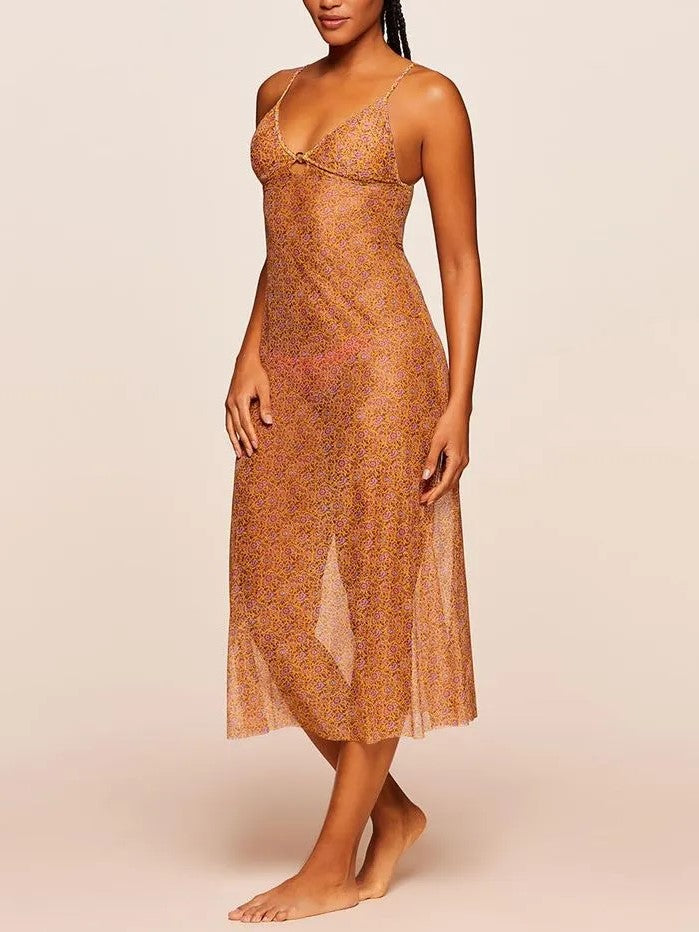 Vestido midi estampado. Presenta copas extraíbles, detalle de aro en el escote, tirantes ajustables y un diseño fluido.