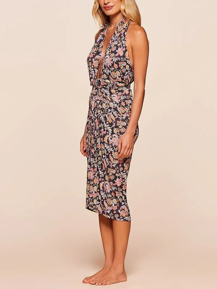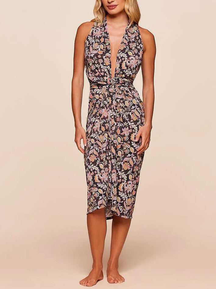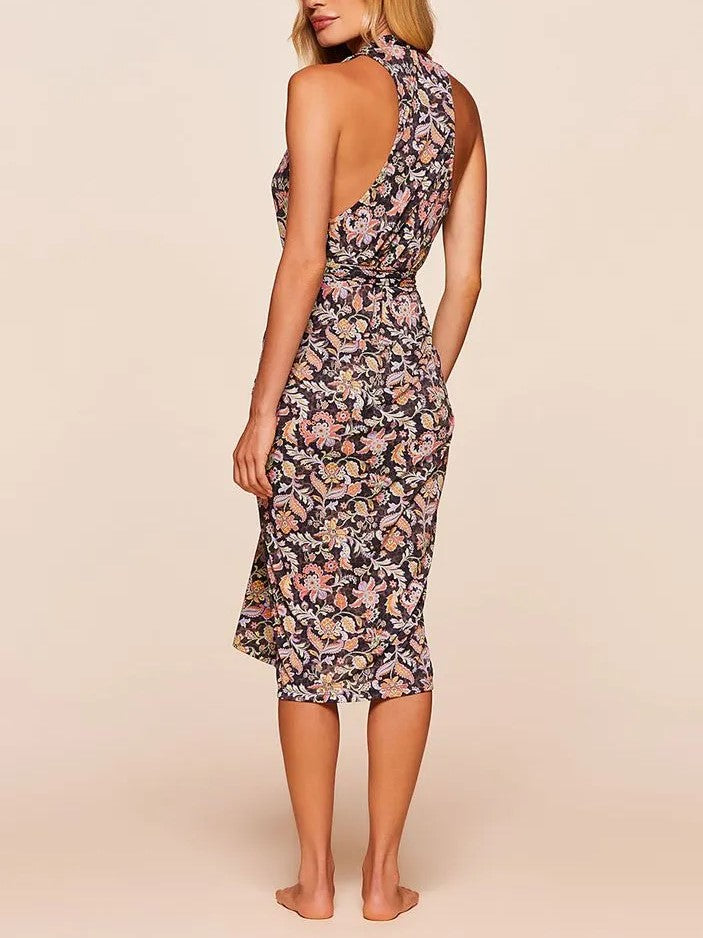 Vestido midi estampado. Presenta un corte cruzado con lazo y escote tipo nadador.