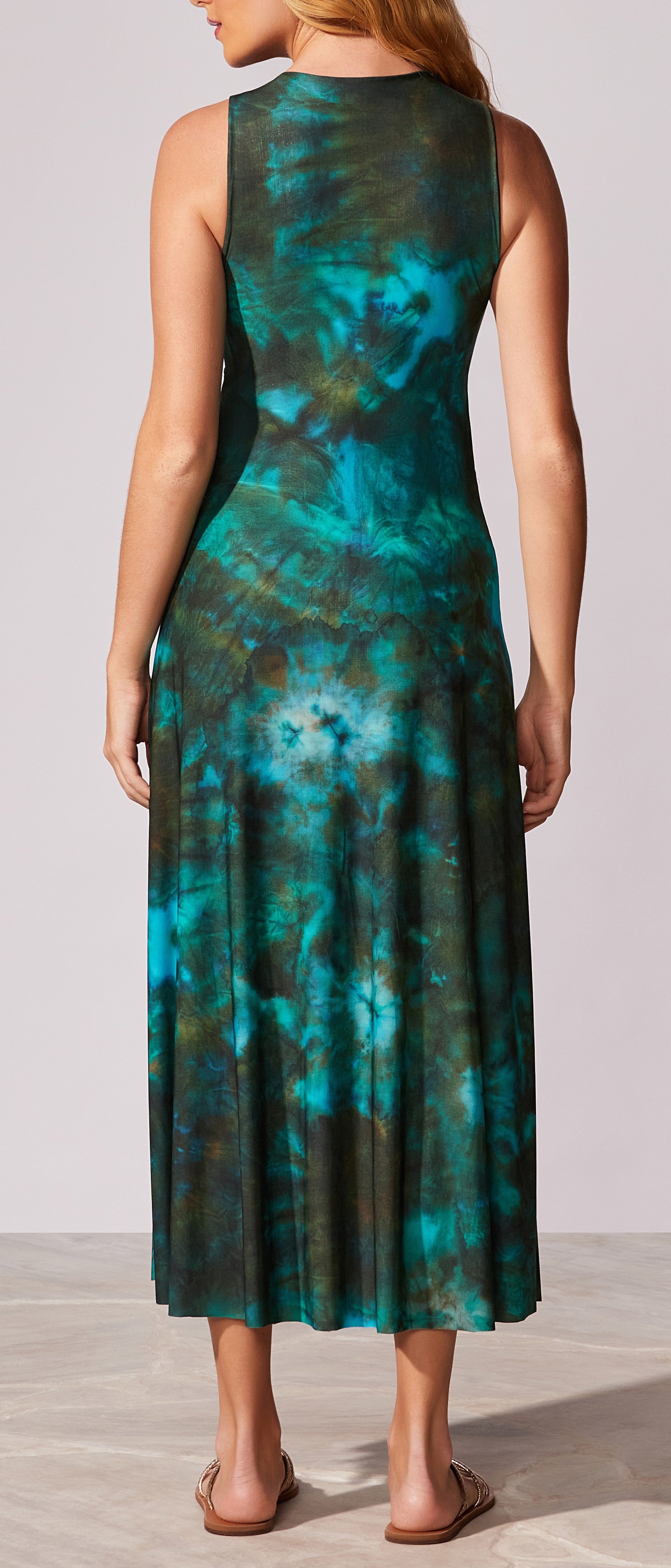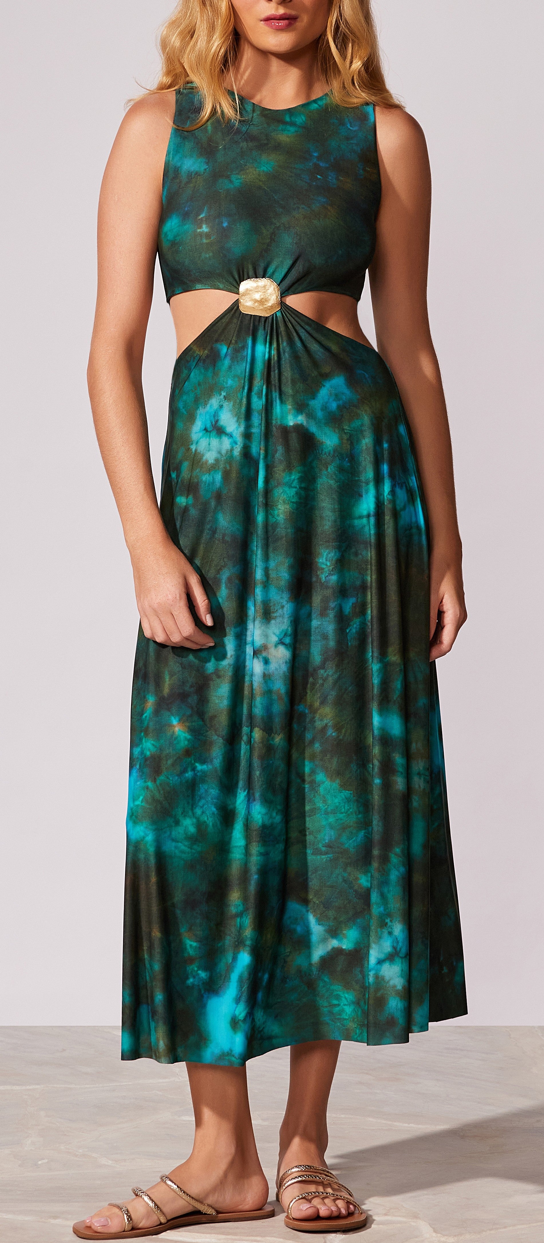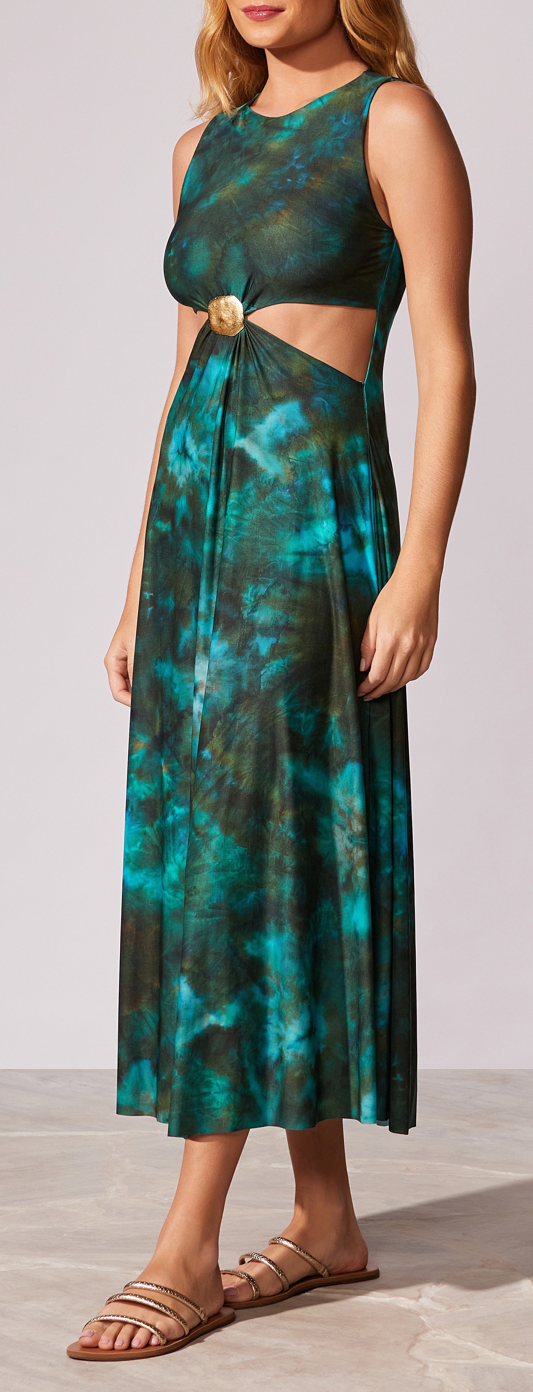 Vestido midiregata e vasê com com recorte na cintura e detalhe de passante de metal no banho ouro velho