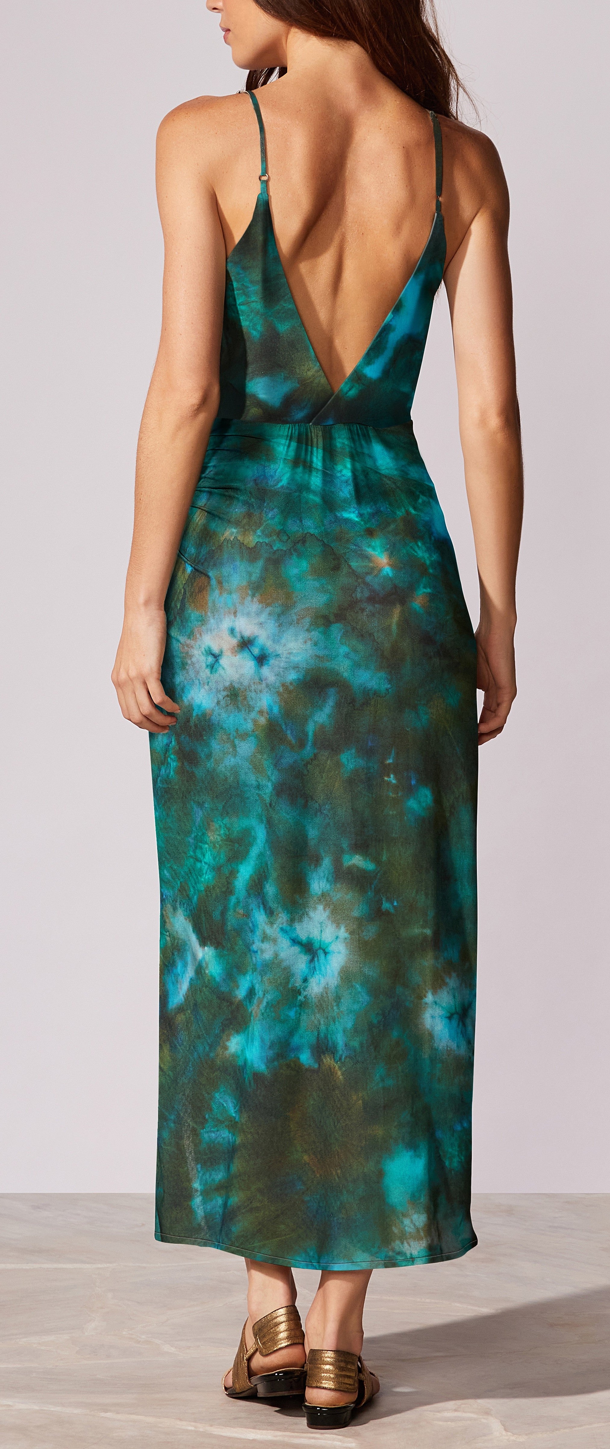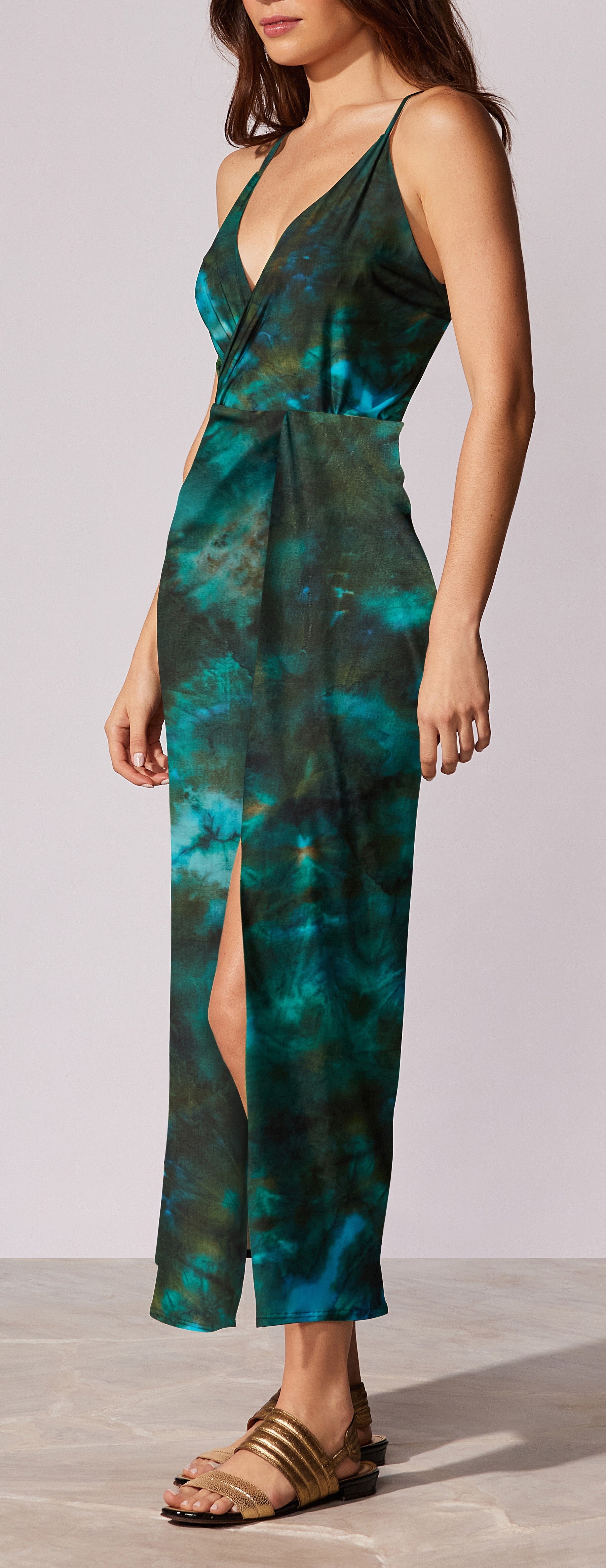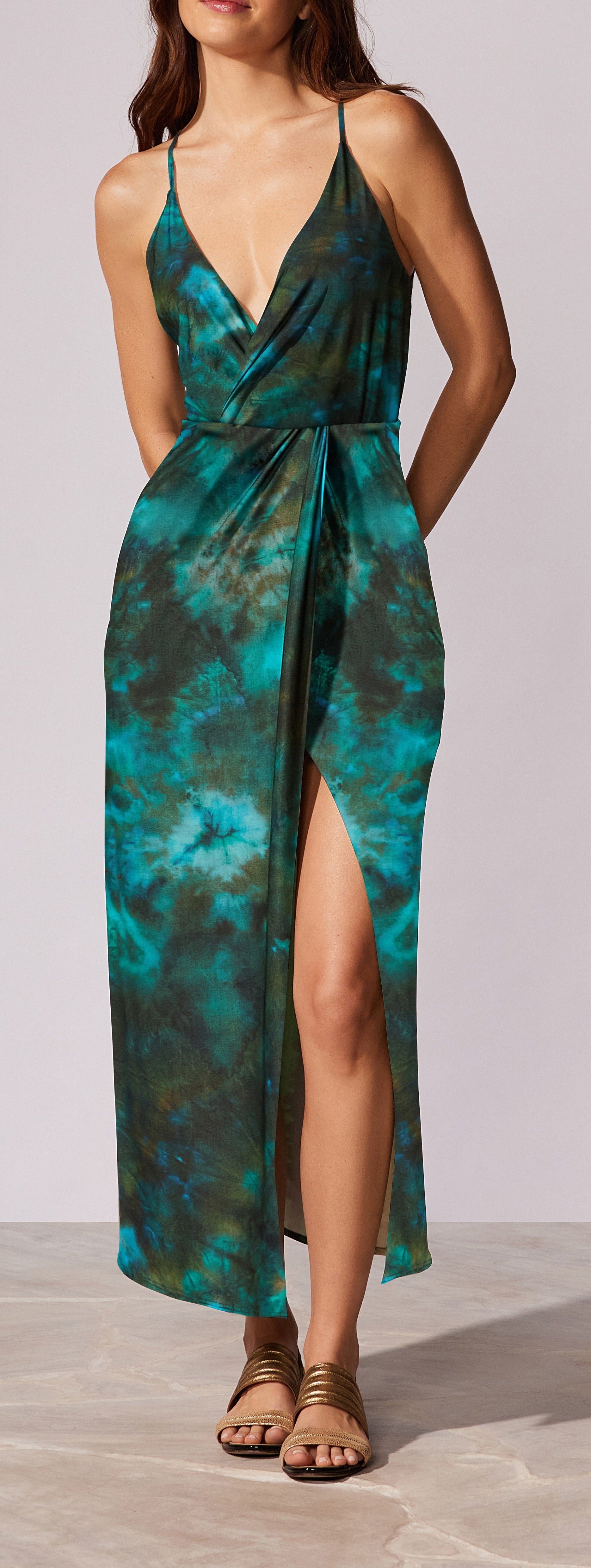 Vestido midi estampado com alça finas reguláveis, decote transpassado e fenda
