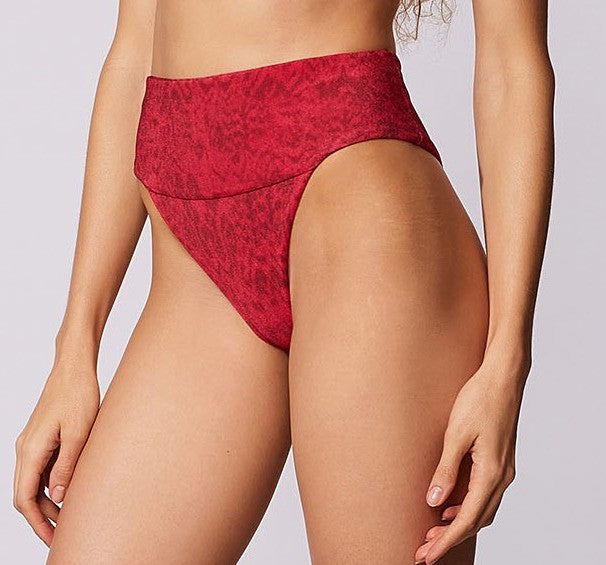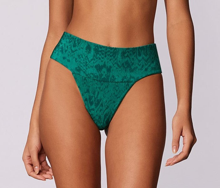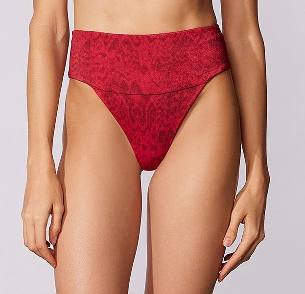 Tanga estampada com cós alto e acabamento embutido, com grande cobertura.